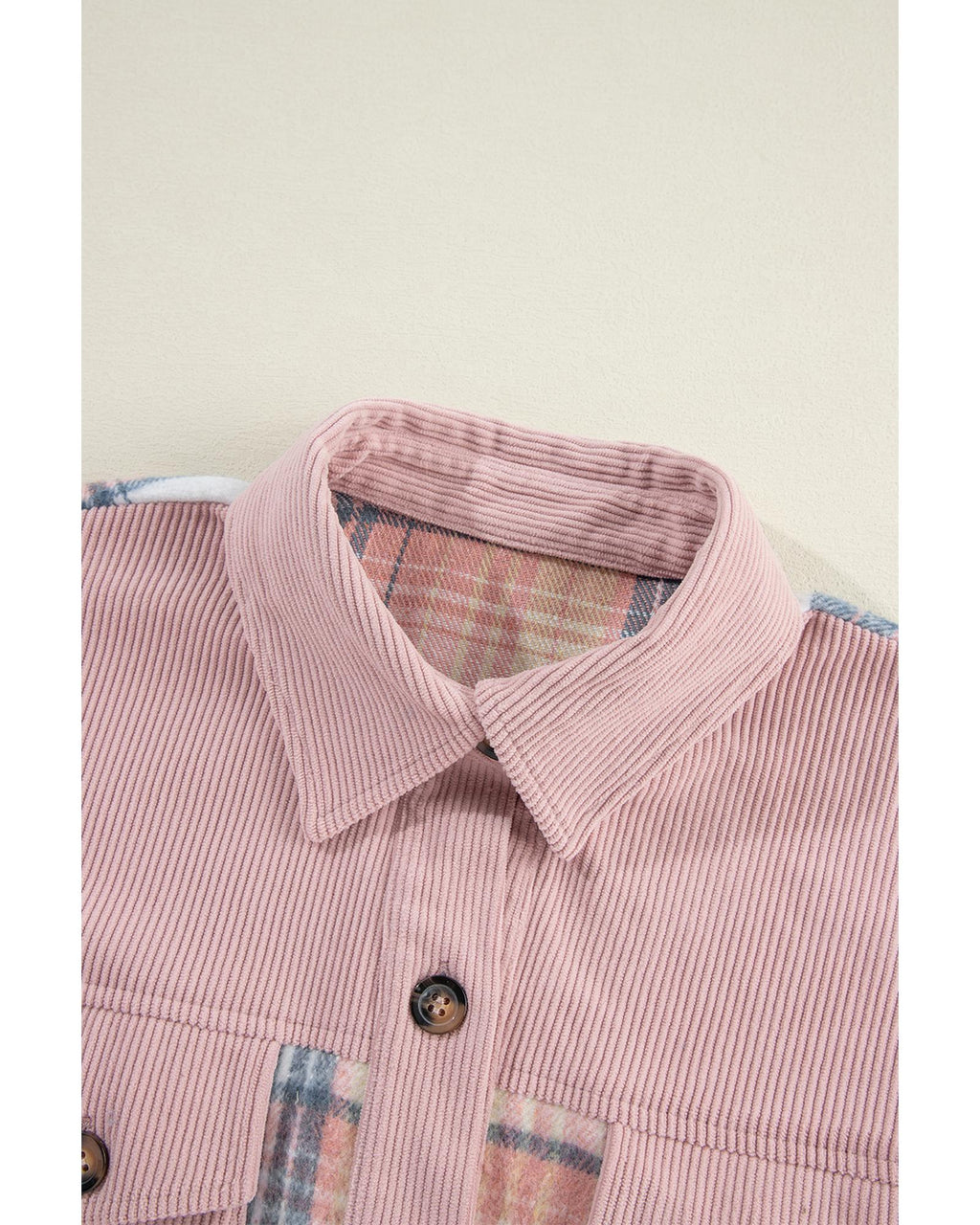 Light Pink Plaid Corduroy Patchwork Chest Pocket Shacket - M