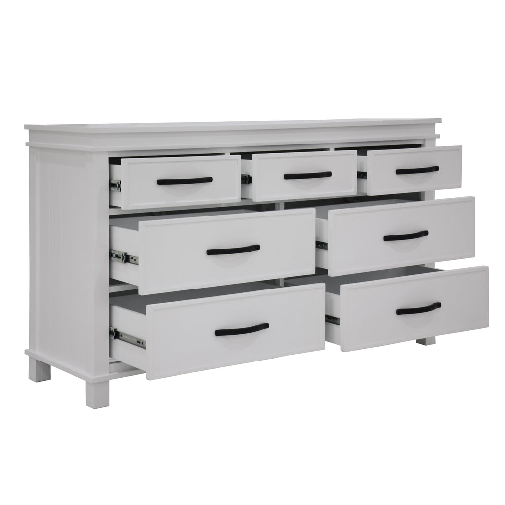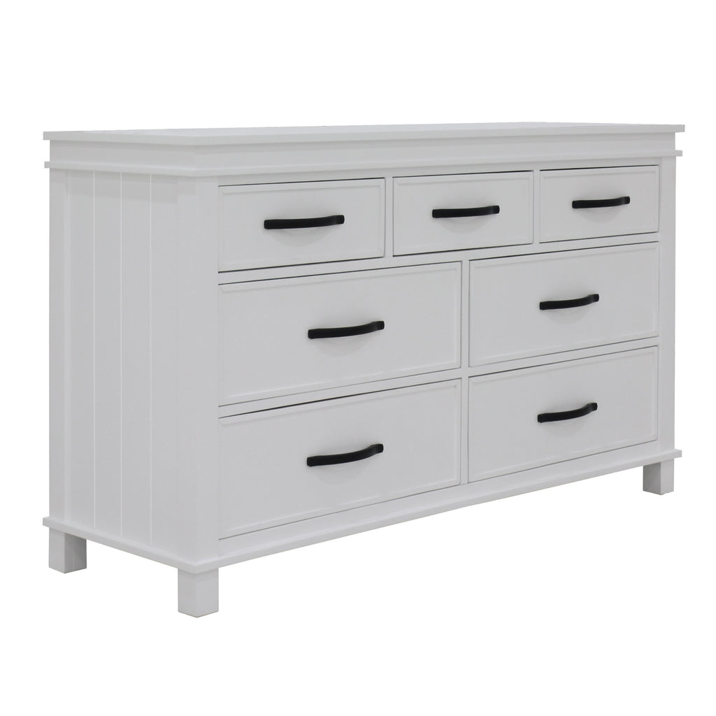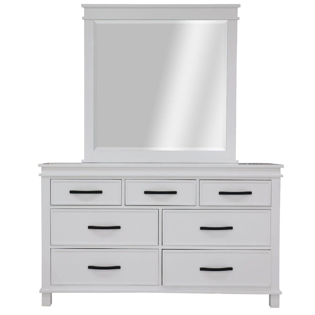 Invite positive vibes into your bedroom by placing this good-looking dresser-mirror set there. The set, which includes a beautifully designed mirror and a spacious 7-drawer dresser, exudes positivity. The set is made of sustainably harvested solid pine wood. The wood is known for its amazing strength, great durability, shock-resistance, and ease of maintenance.The mirror is made of annealed glass of the highest quality. This type of glass gives the mirror a long lifespan. You may hang the mirror on a wall or attach it to the dresser. The dresser features plenty of storage space with large 3 over 4 drawers where you can neatly store your bedroom stuff and keep the room well organised. The sturdy drawers have full-extension metal runners and smooth-on-touch metal handles with an antiqued finish. The set is designed in the traditional style to give a bedroom a fashionable look. The dresser-mirror set in a white painted finish goes well with practically any interior decor style. A one-year warranty is included with the fully assembled dresser and mirror.