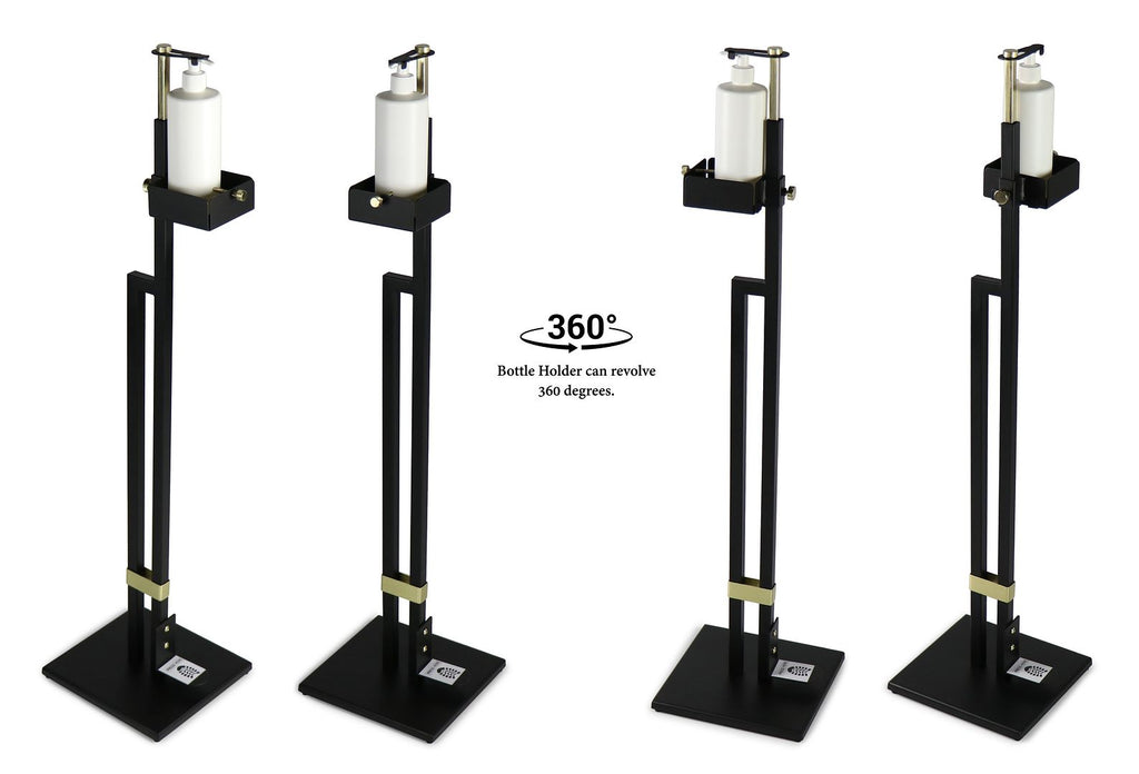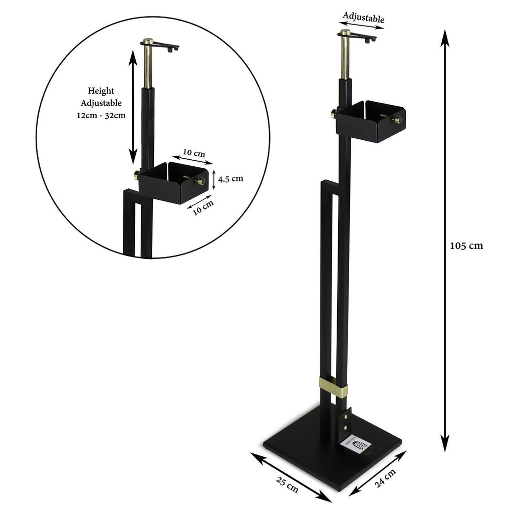 The Lirash Touch Free Hand Sanitiser Dispenser Station Floor Stand Foot Operated - Gold Black makes hand hygiene convenient and extremely easy to implement in both commercial and residential settings. With the flexibility of placing any sanitiser bottle you like, this stand is ideal to make sanitisation accessible within retail shops, workplaces, cafés, restaurants, libraries, medical centres, schools and more.