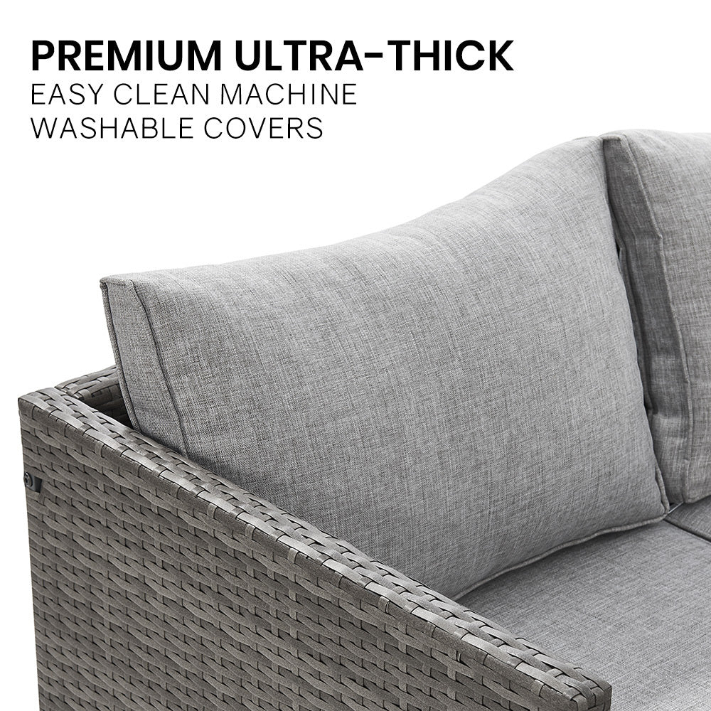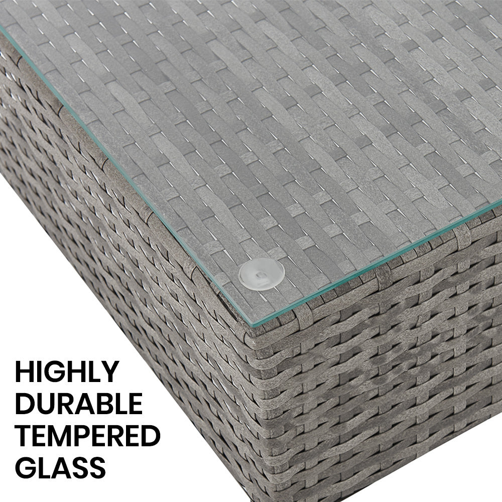 This London Rattan 4-Piece Outdoor Lounge Set is stylish and ensures supreme comfort. It includes UV-resistant Suntech wicker, a durable tempered glass tabletop, and premium ultra-thick easy-to-clean chair cushions with high-quality machine-washable covers. It also includes a generous storage container equipped with a gentle soft closing mechanism.