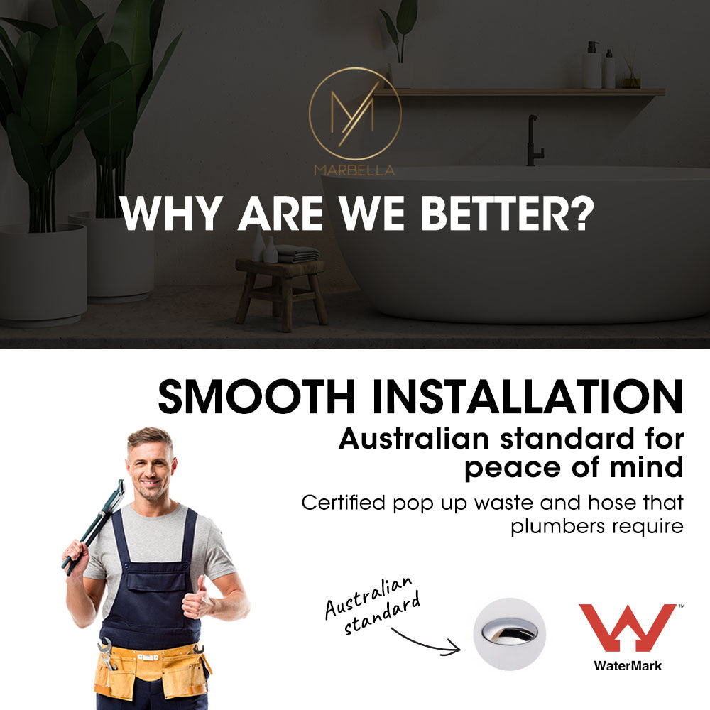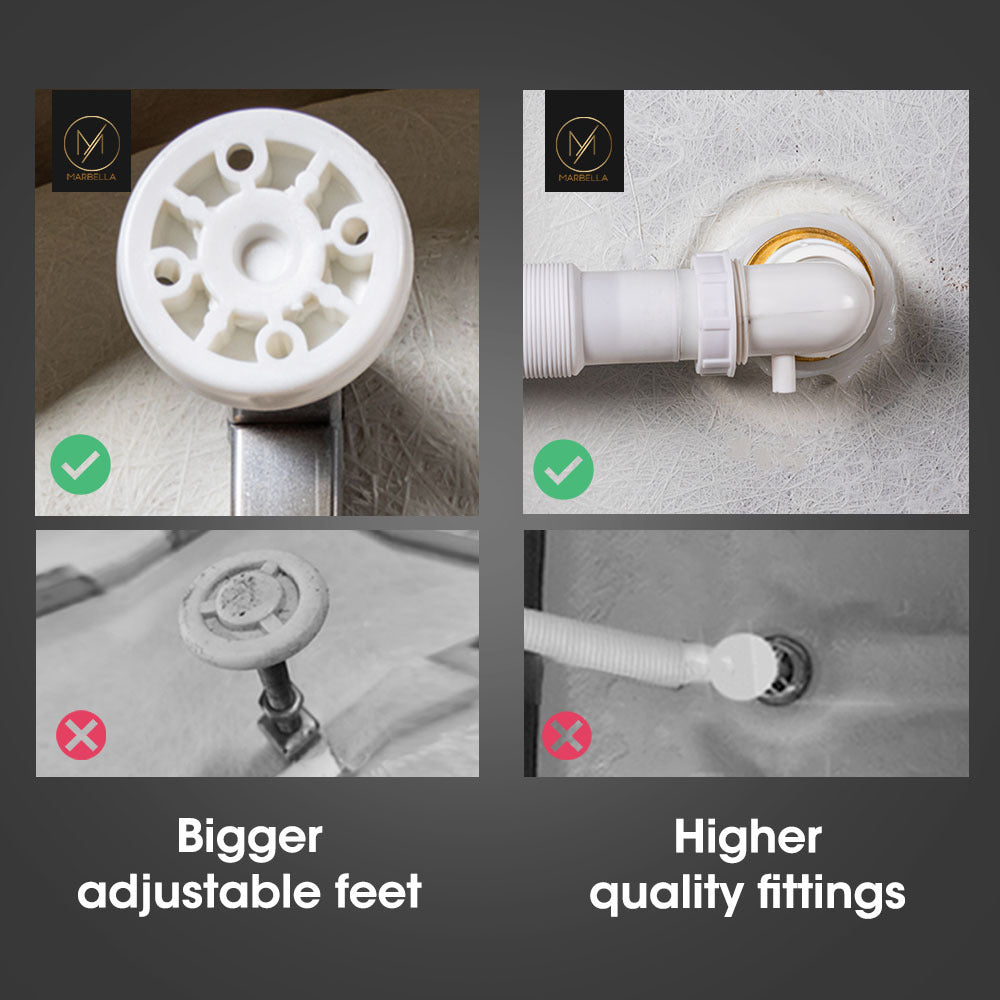 Designed in accordance with the Watermark Australian plumbing standard it comes complete with an approved chrome popup waste and extendable drainage hose. Marbella bath tubs are shipped in premium reinforced packaging with handles.The Aristo features large adjustable feet for simple and stable installation.