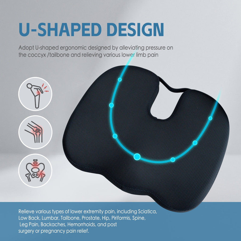 Memory foam seat cushion assists natural hip alignment and promotes healthy posture. Cut-away reduces pressure on the coccyx, back, and hip bones. Helps relieve pressure caused by long sitting sessions.