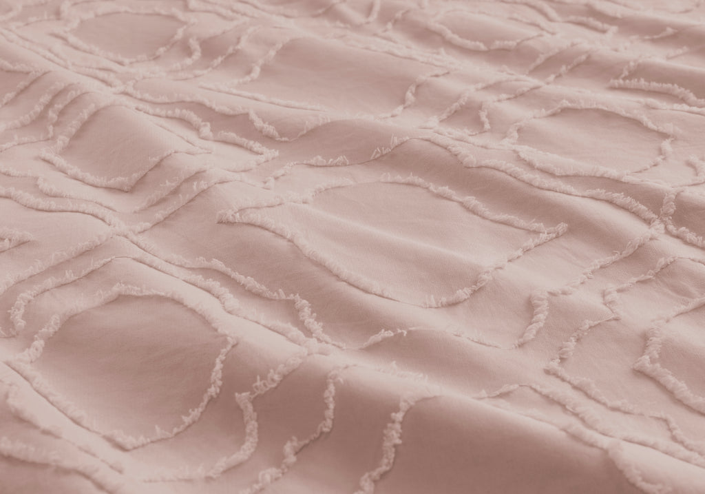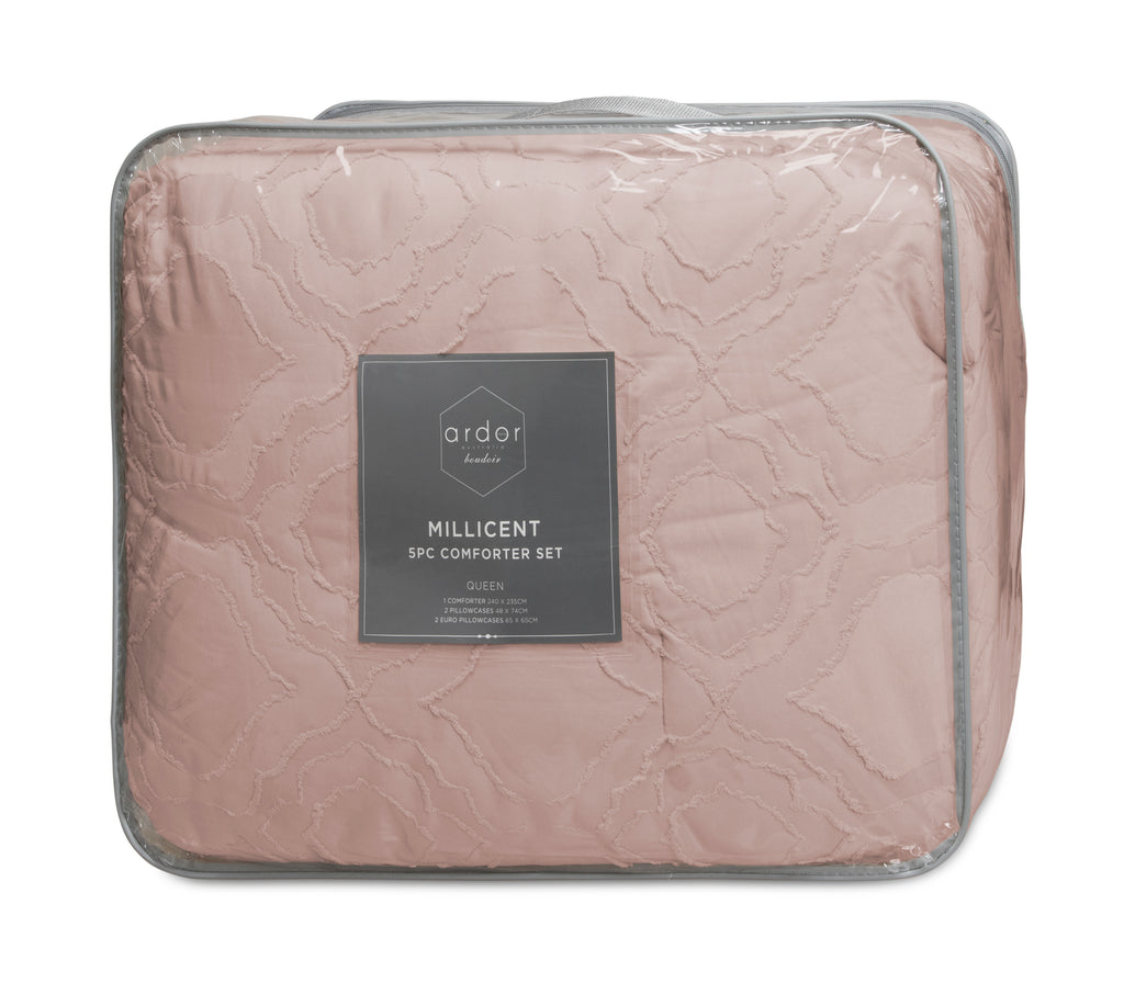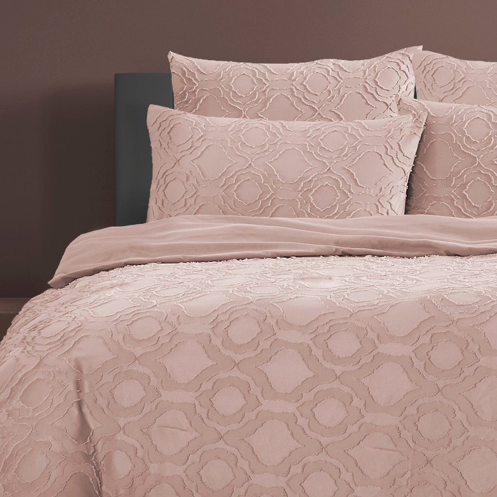 illicent's peachy front displays a tufted pattern that softly gestures inspiration from floral tiles with a plain dyed reverse. This comforter set consists of 5 pieces - 1 x Comforter, 2 x Standard Pillowcases and 2 x European Pillowcases that will completely transform the bedroom aesthetics into tranquility.