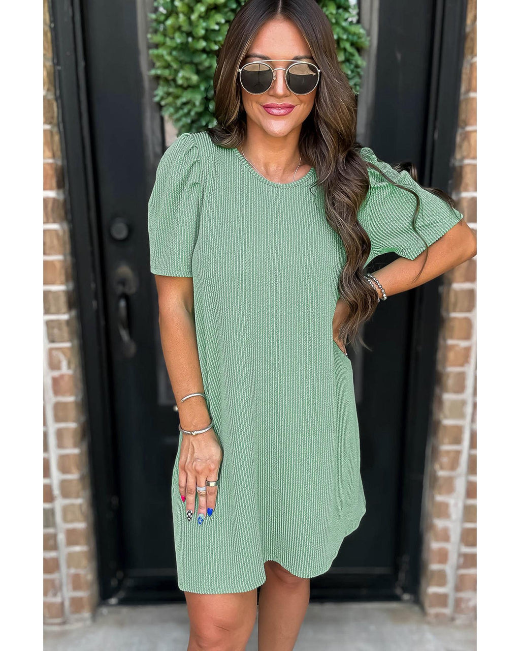 • Mint Green Corded Knit Crew Neck Puff Sleeve Shift Mini Dress