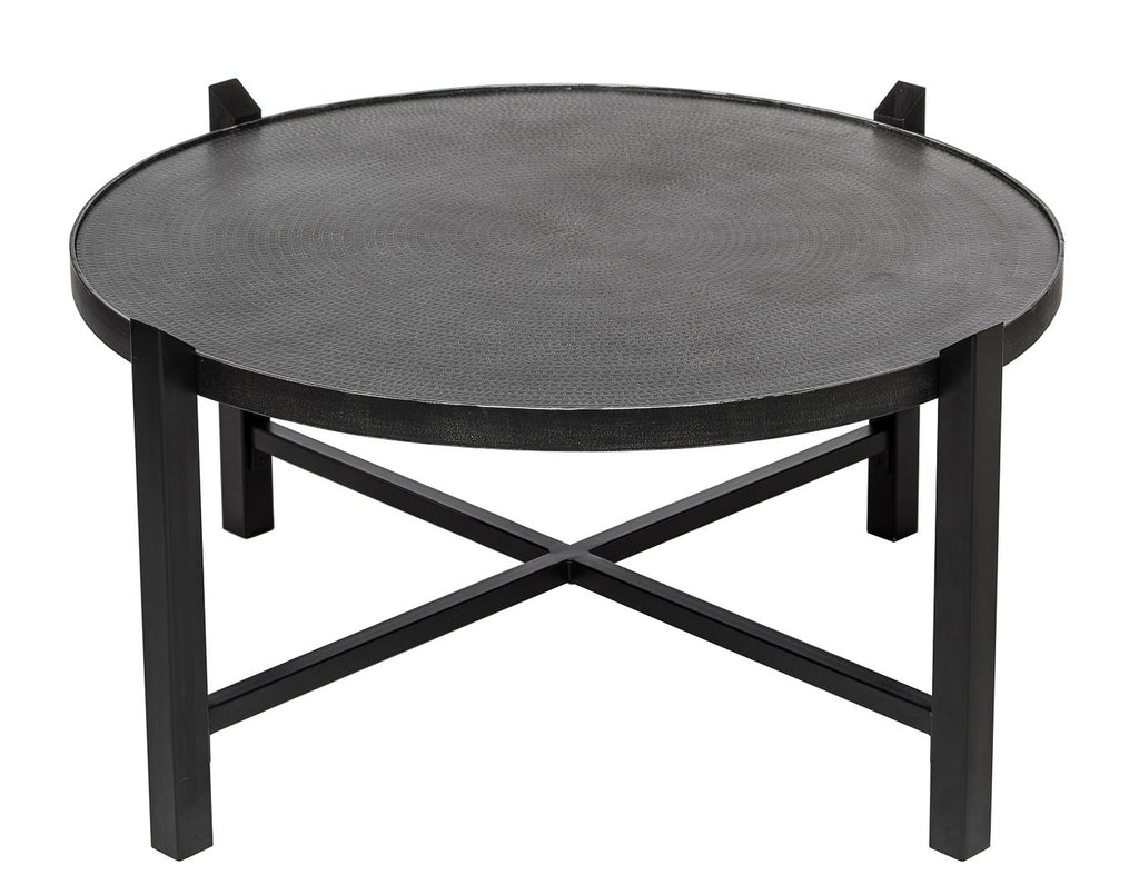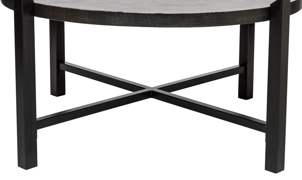 This Modern Black Round Coffee Table with Silver Finish Engraved Top will provide any Room with cutting edge style and dignify its surroundings. Boasting a Large Wrought Iron Top with intricately carved Croc Pattern adds great appeal to the overall piece. With its full body manufactured from 100% Wrought Iron, this product promises great sturdiness and durability.