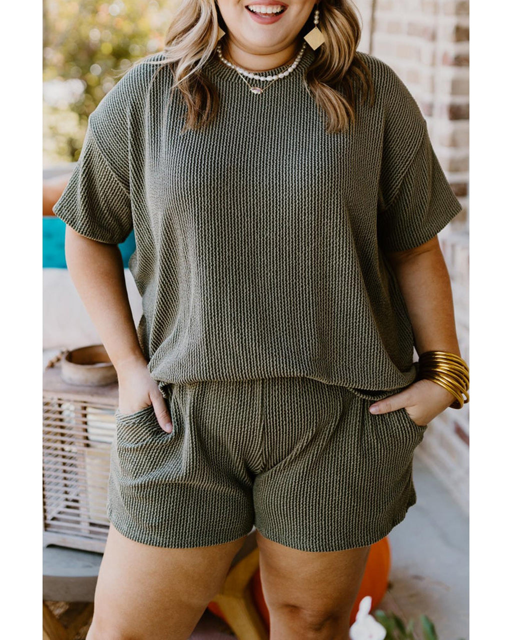 - Moss Green Plus Size Rib Knit Short Sleeve Top and Shorts Set