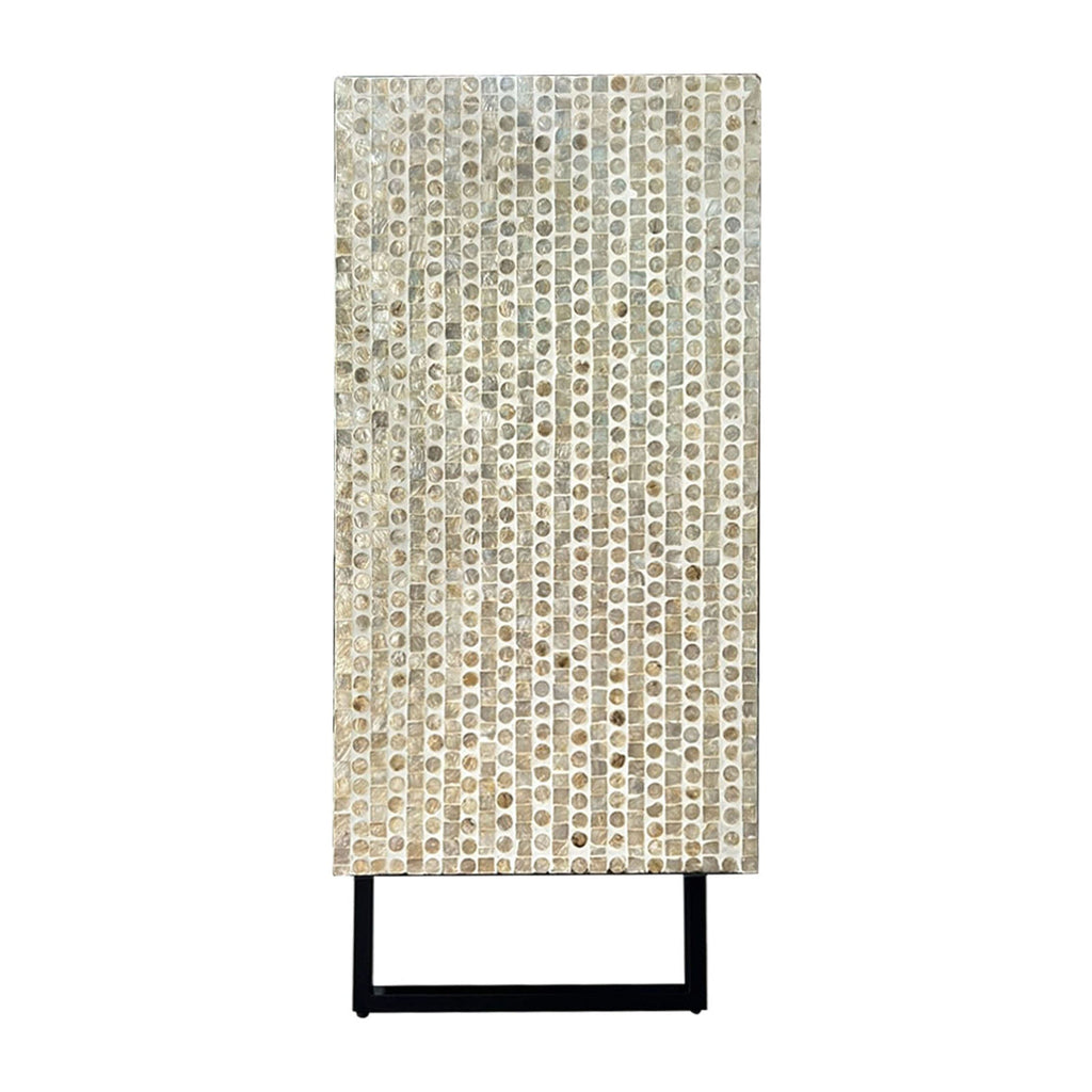 Indulge in the luxurious beauty of our hand crafted Mother of Pearl sideboard! Our expertly made swirl patterns add a unique touch to any room. Elevate your space with the elegance and quality of this breathtaking piece. Satisfaction guaranteed!