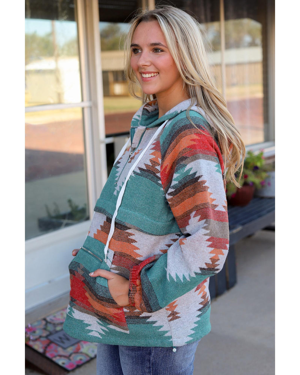 • Multicolor Aztec Print Zipped Split Neck Hoodie