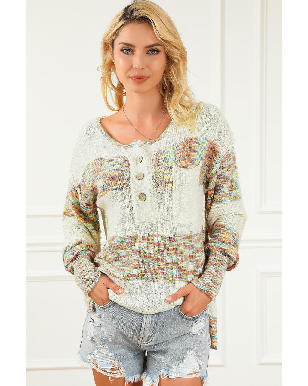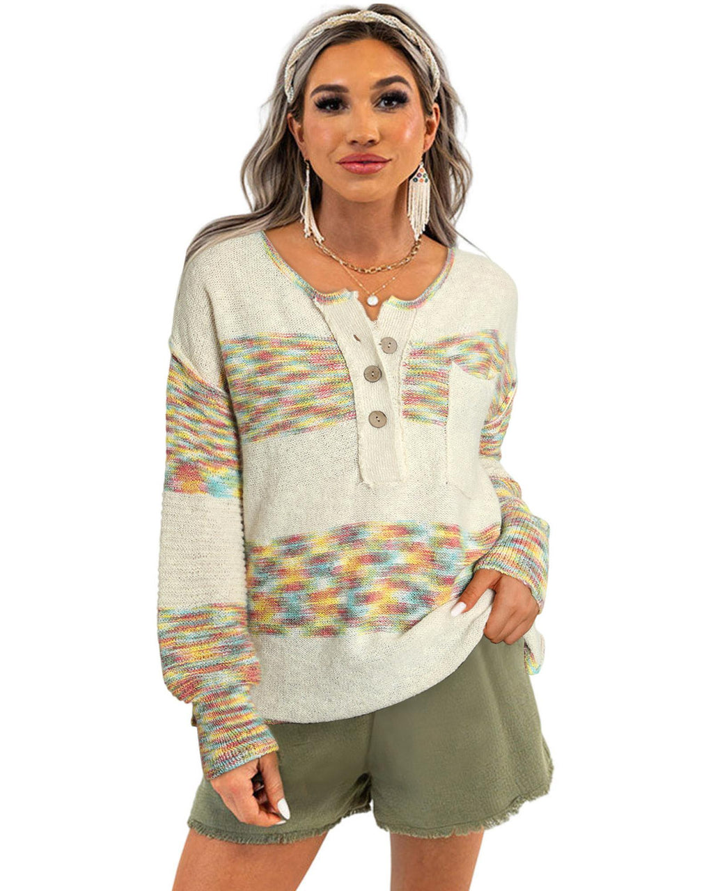 • Casual and trendy Multicolor Space Dye Henley Knit Sweater