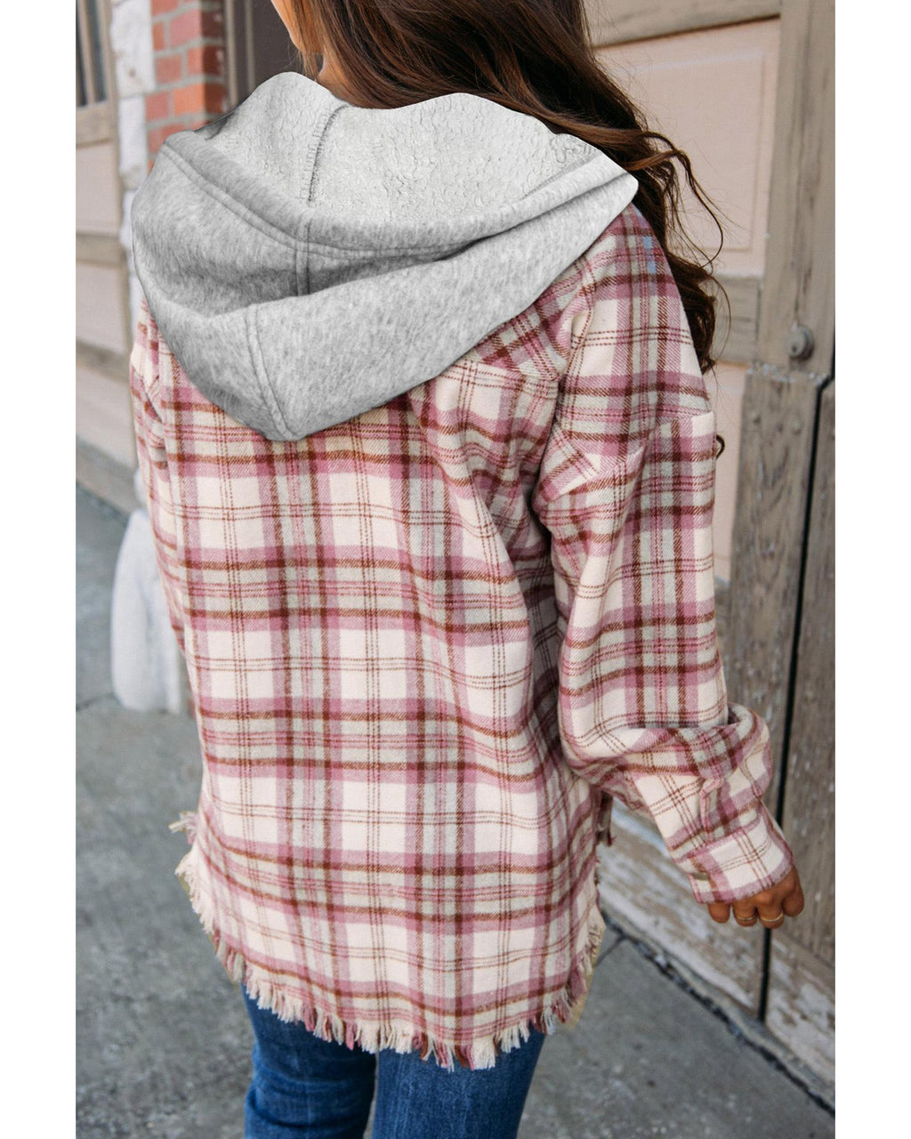 Multicolour Plaid Flap Pocket Hooded Raw Hem Jacket - L
