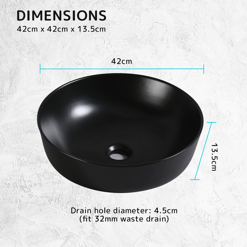 Muriel Ceramic Bathroom Basin Vanity Sink Round Above Counter Top Mount Bowl 42 x 42 x 13.5cm - Black