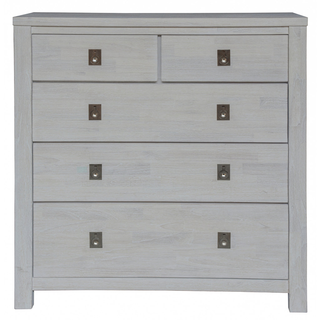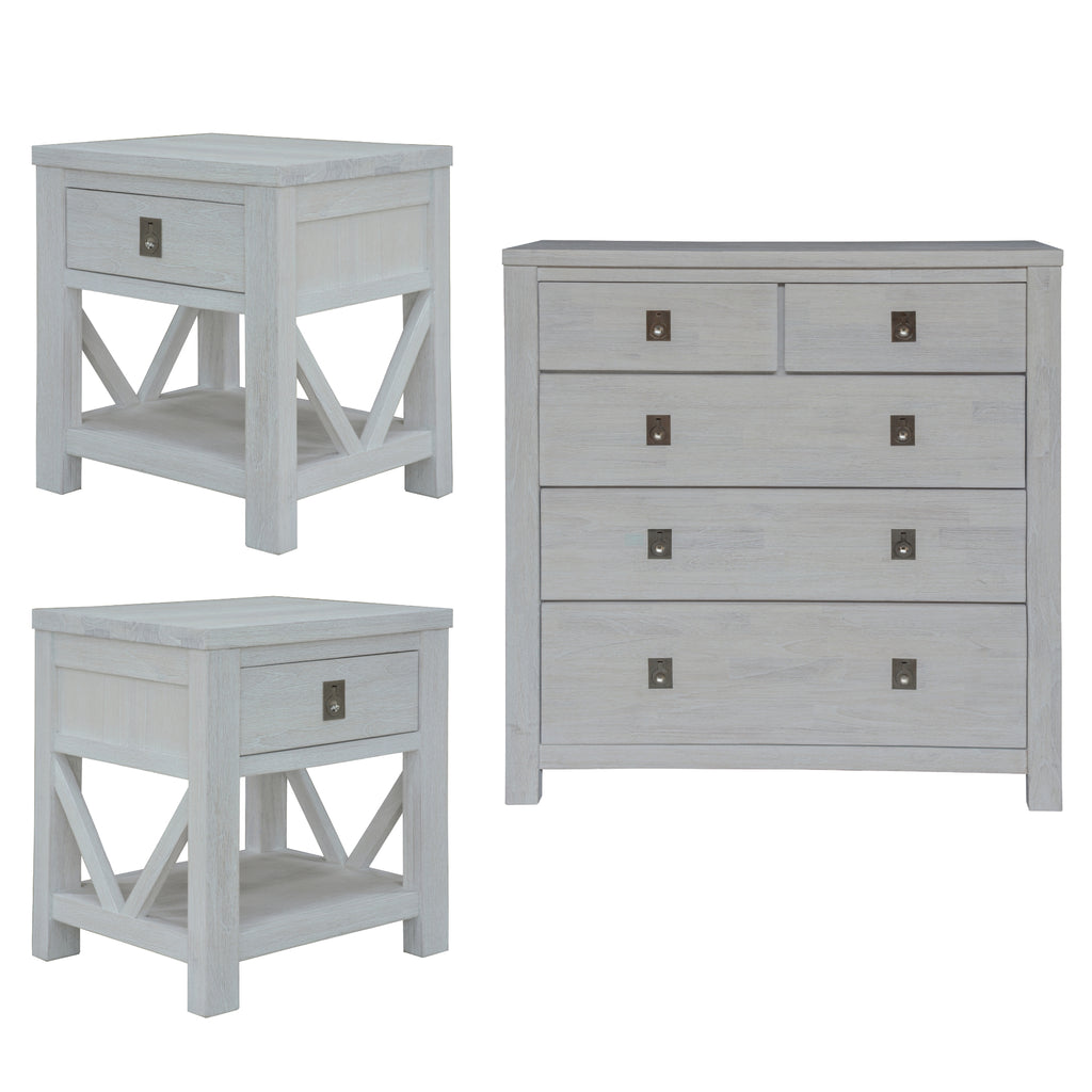 This tallboy-bedside set is crafted in a coastal style. The tallboy has 5 drawers; 2 over 3 drawers and each bedside have 1 drawer and 1 shelf. A V-shaped pattern makes the bedside look attractive. All the drawers have full metal extension runner and textured metal handle in silver colour. The furniture is made of sustainably harvested solid Mindi wood. The wood is known for its amazing strength, durability, shock-resistance, and ease of maintenance. The furniture set in a white-washed finish goes well with a variety of interior decor styles, and a one-year warranty is included with the fully assembled furniture pieces.