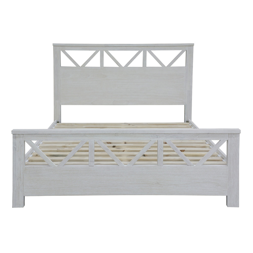 This king bed is crafted in a coastal style. A distinctive headboard and footboard with V-shaped pattern gives a sophisticated look to the bed. Further, a solid wood slat system with central support legs gives the bed great robustness. It is made of sustainably harvested solid Mindi wood. The wood is known for its amazing strength, durability, shock-resistance, and ease of maintenance. The easy-to-assemble bed in a white-washed finish goes well with a variety of interior decor styles, and a one-year warranty is included with the bed frame.