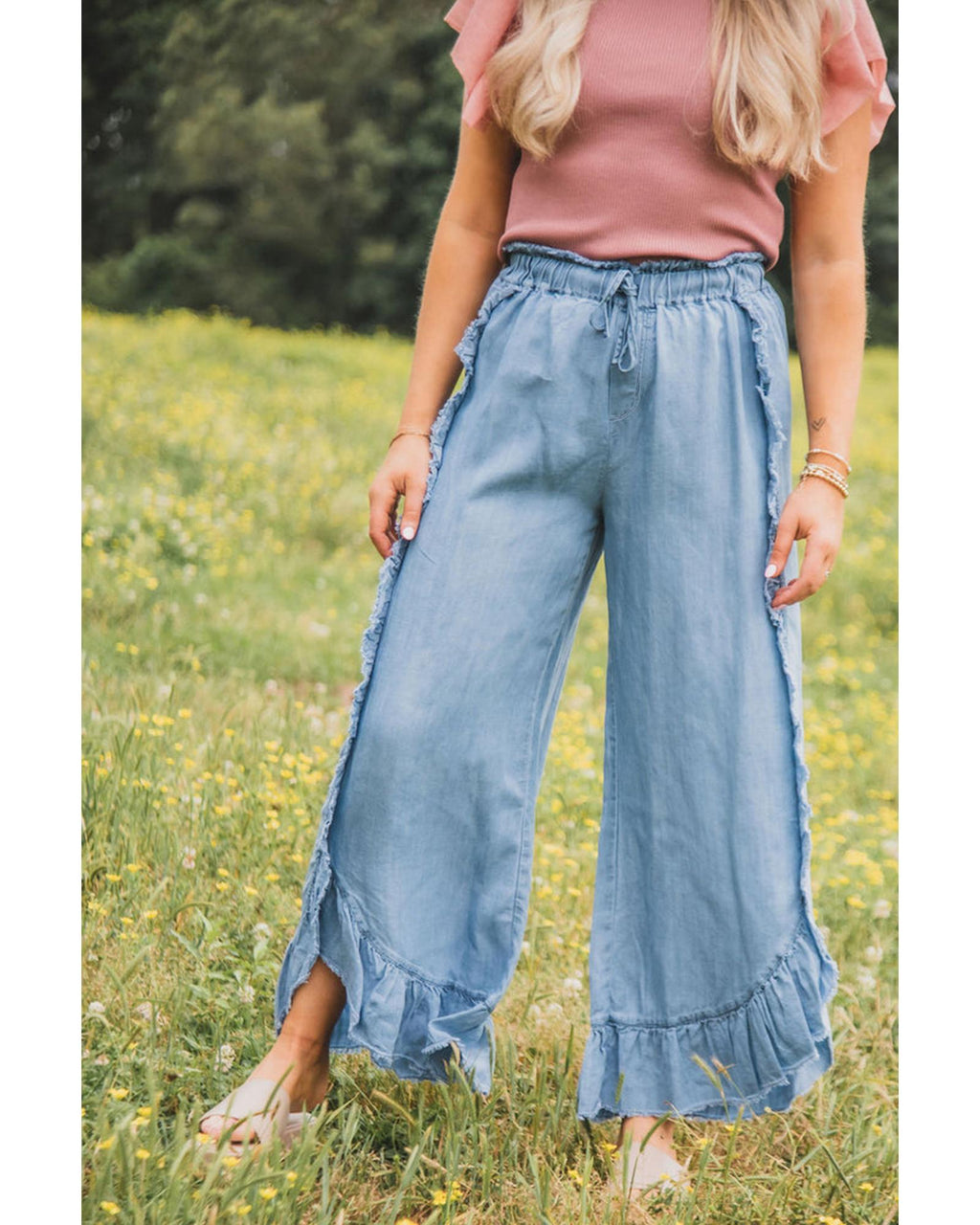 Myosotis Light Wash Raw Hem Ruffled Wide Leg Jeans - 8 US
