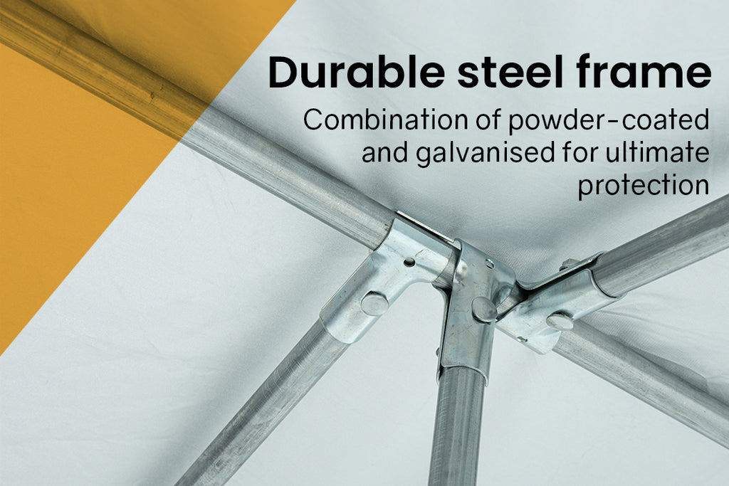 The frame comprises of a combination of galvanised and powder coated steel pieces that inhibits rust. It features a push button attachment system and supplied cable ties makes assembly straightforward for two people.