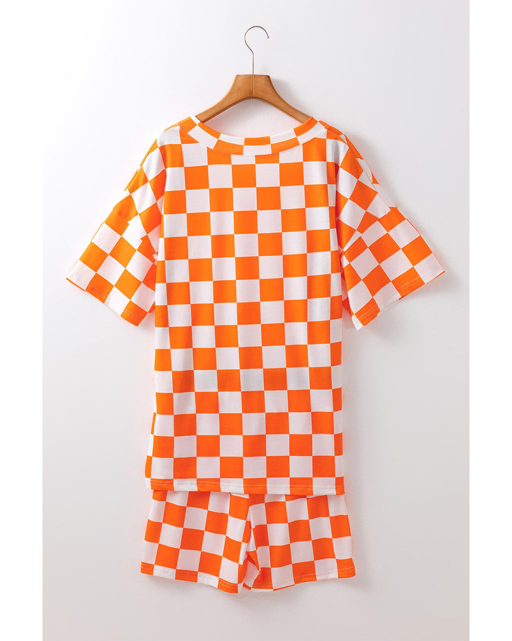 Orange Checkerboard Print V Neck Loose Tee and Shorts Lounge Set - S