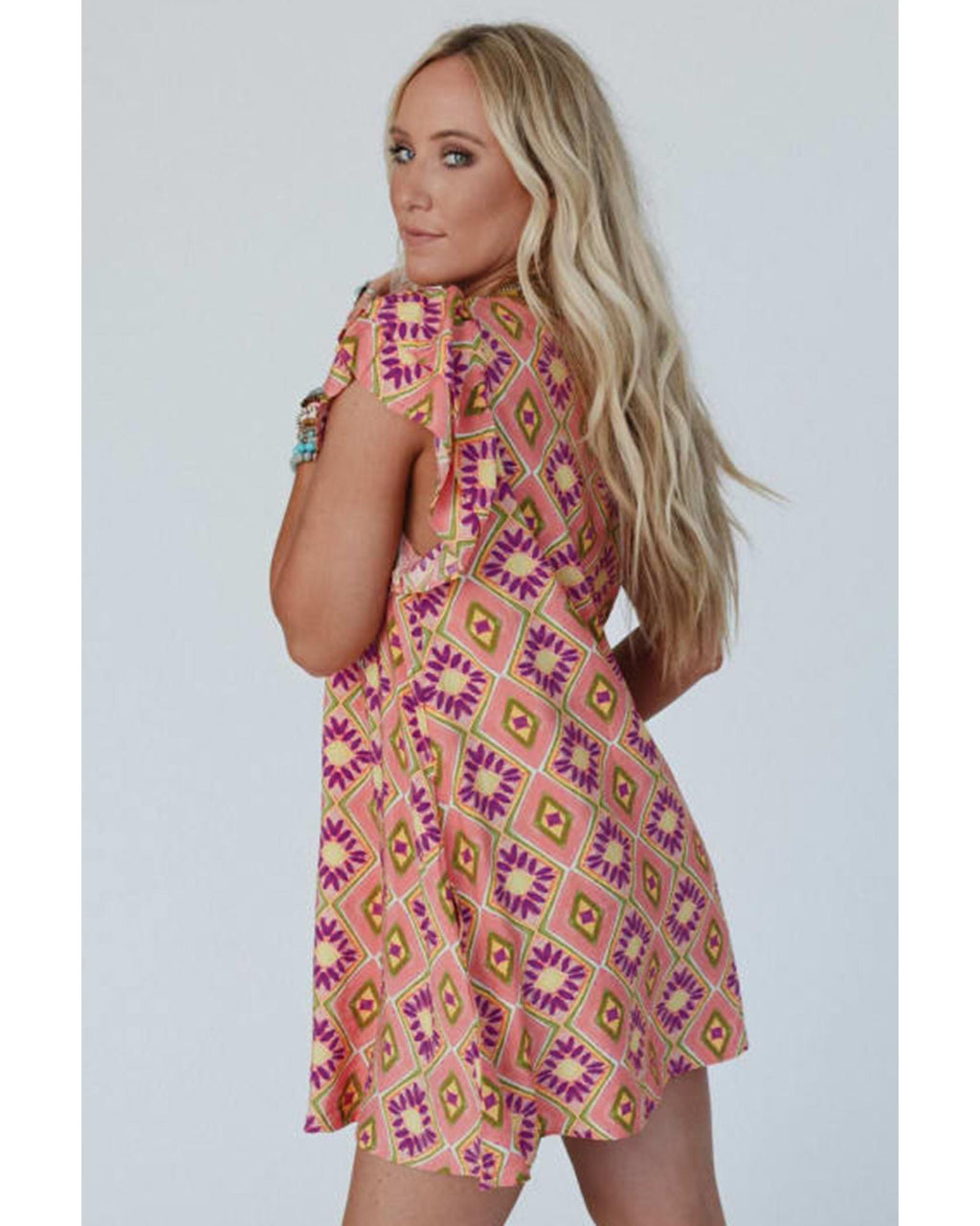 Orange Geometric Floral V Neck Buttoned Ruffled Sleeve Mini Dress - M