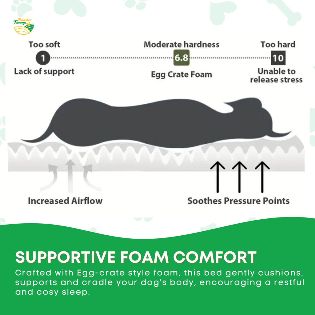 • Supportive Foam Comfort – Egg-crate style foam gently cushions your dog’s body for enhanced relaxation and a cozy rest.