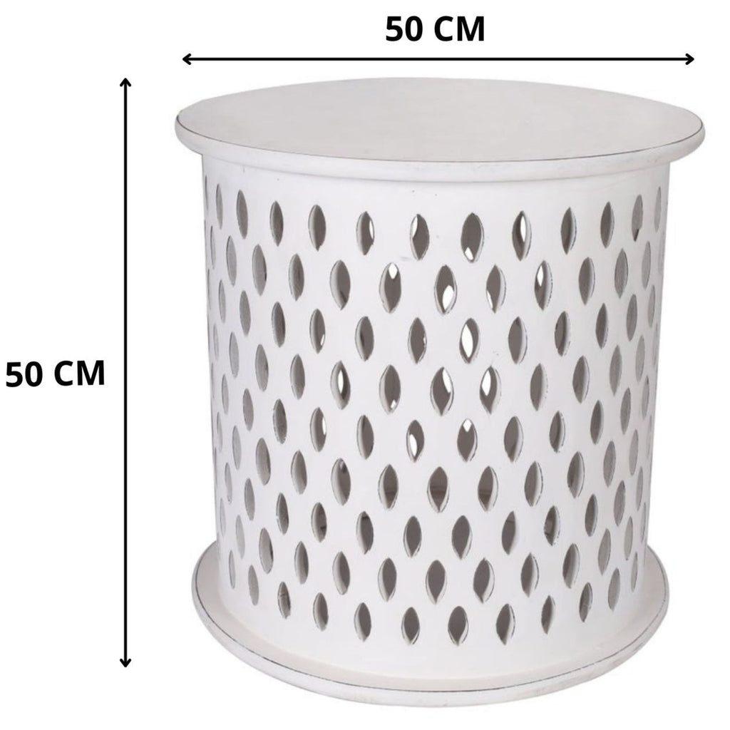 This extremely beautiful side table gives a fresh charm to your living space. With its distinct design, round shape, and white colour, the traditional style side table will add a new dimension to your living area. The table is designed in an exotic pattern using sustainably harvested solid mango wood. The wood ensures the table's high water resistance, long durability, and beautiful appearance. It will become the perfect companion for any kind of lounge or sofa, while becoming a beautiful spot to keep lampshades, vases, photo frames, etc.The fully assembled side table comes with a one-year warranty.