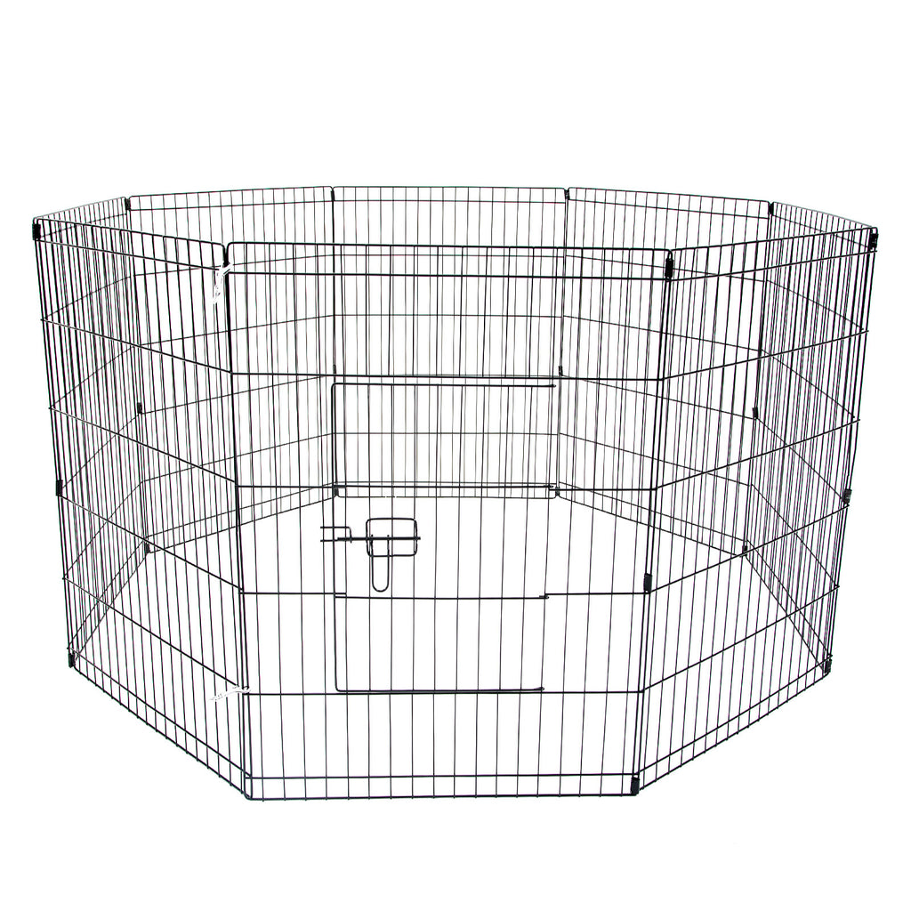It features as 8 panels for multi-configuration which allows you to turn your playpen into different shapes. Made of durable steel frames construction with black powder coat finish provides Long Lasting Protection and weather resistance. The access door with bolt latches you can be sure that your pet doesn't have the opportunity to run away and the round edges ensure pet safety.