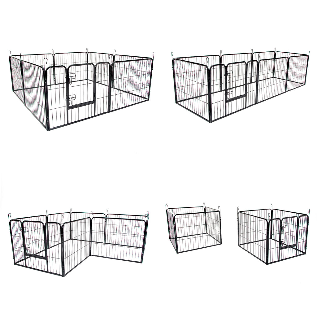 It is a multi-configuration playpen with 8 panels which allows you to turn your playpen into different shapes. The playpen is made of durable extra heavy duty steel frames construction with black powder coat finish. This fine finish provides long lasting protection and weather resistance. The access door has bolt latches and this ensures that your pet doesn't have the opportunity to run away and the round edges ensure pet safety.