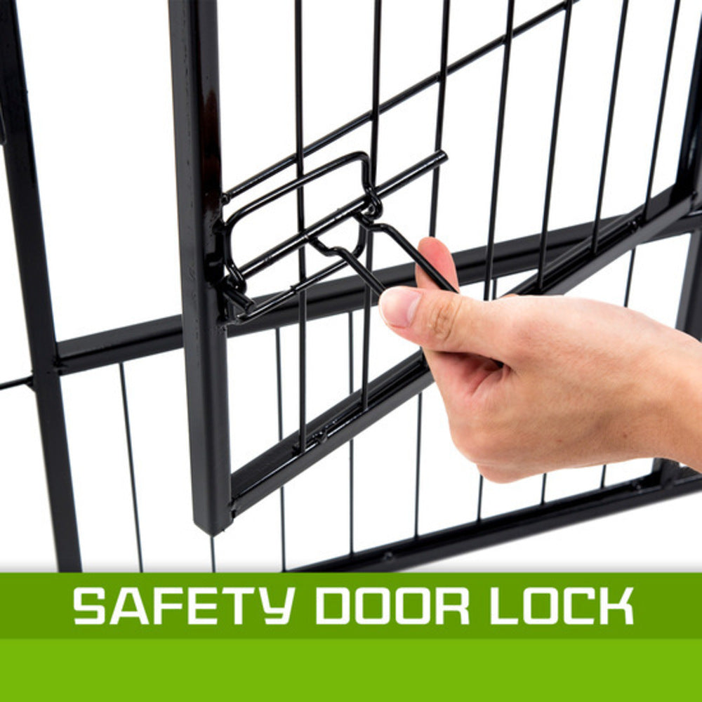It is a multi-configuration playpen with 8 panels which allows you to turn your playpen into different shapes. The playpen is made of durable extra heavy duty steel frames construction with black powder coat finish. This fine finish provides long lasting protection and weather resistance. The access door has bolt latches and this ensures that your pet doesn't have the opportunity to run away and the round edges ensure pet safety.