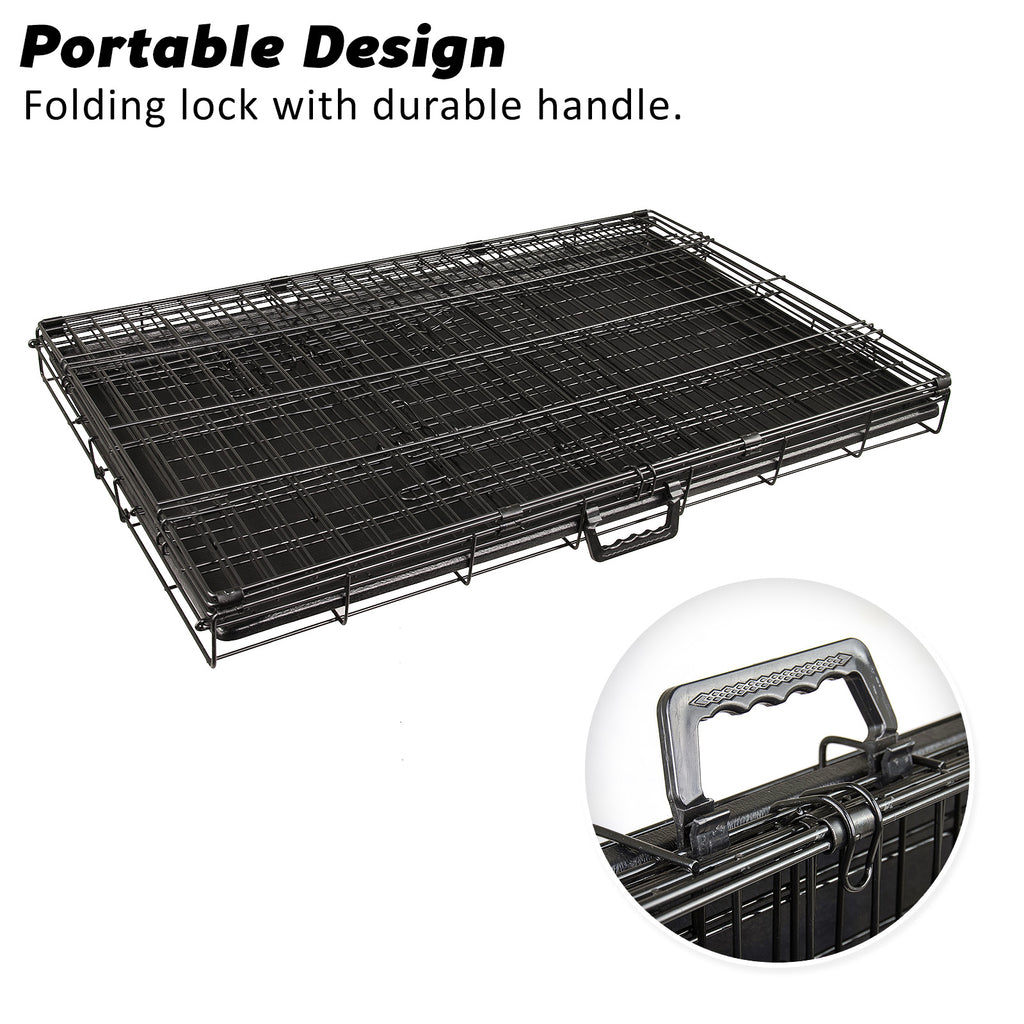 This convenient wire dog crate feature double access doors that provide easy access for your dog to easily enter and exit, as well as dual safety locks on each door to keep your pup securely inside. Built with quality sturdy wire construction with black powder-coated finish. The slide-out / removable plastic tray for easy cleaning.