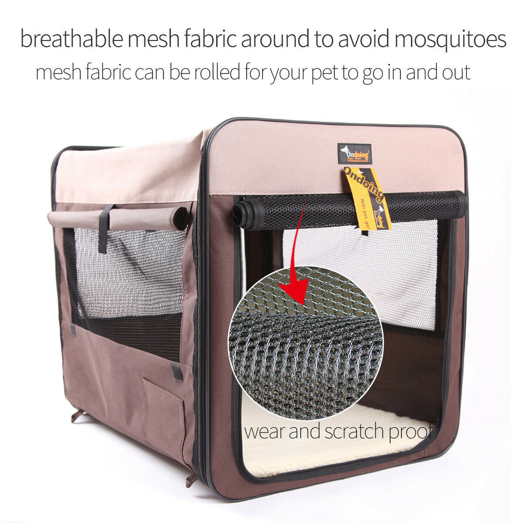 MULTI-USE : Soft pet indoor/outdoor crate, 2 mesh windows with curtain, large mesh opening. Suitable for car back seats and boot.
