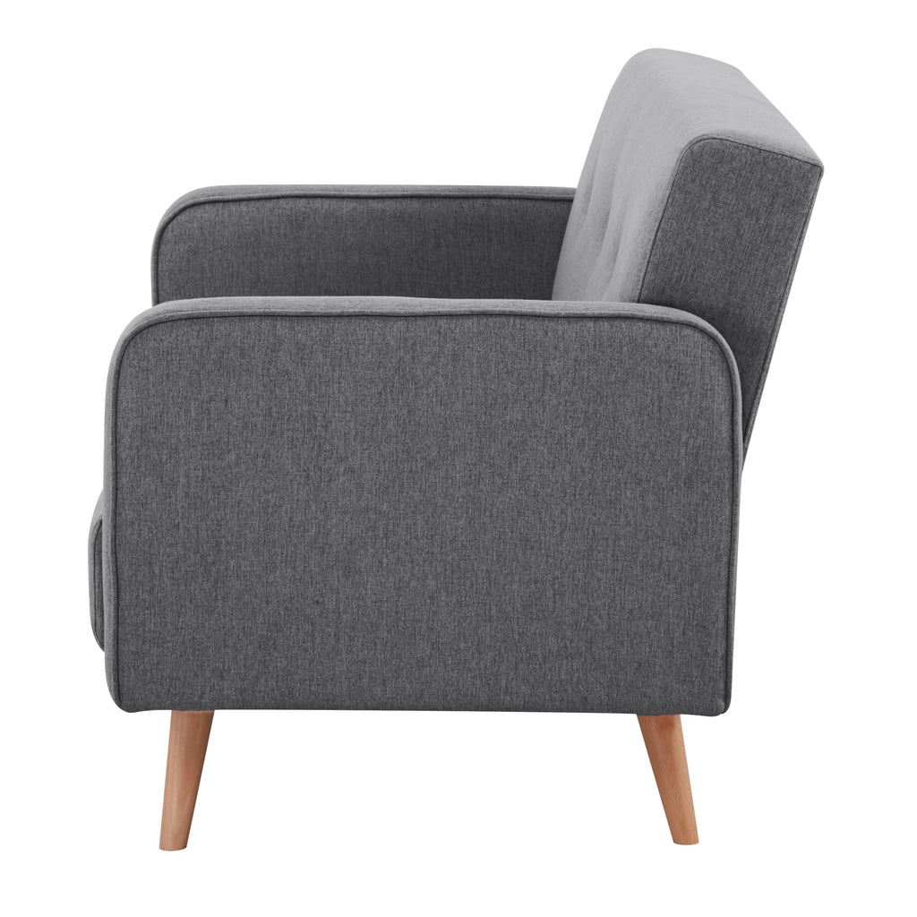 This beautiful sofa in a dark grey colour assures total comfort. The Scandinavian-style furniture is upholstered in plush upholstery made of high-performance 100% polyester. A fixed cover with buttons gives the sofa a sweet and charming look. The solid pine wood and plywood frame make the sofa light and highly durable. The sturdy frame with seating support made of foam, fabric, and high-tensile S springs ensures blissful comfort when you relax on it. Wooden legs in a natural wood colour give the furniture a strong base. The sofa is easy to assemble; only the legs need assembly. The long-lasting furniture comes with a 1-year warranty.