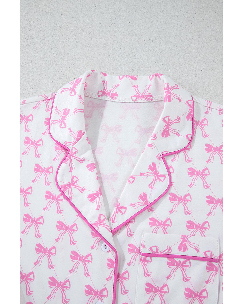 Pink Bowknot Printed Short Sleeve and Ruffled Shorts Valentines Pajama Set - XL