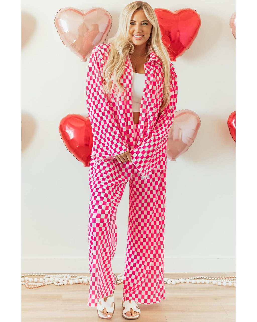 Pink Checkered Buttoned Shirt and High Waist Pants Pajama Set - M