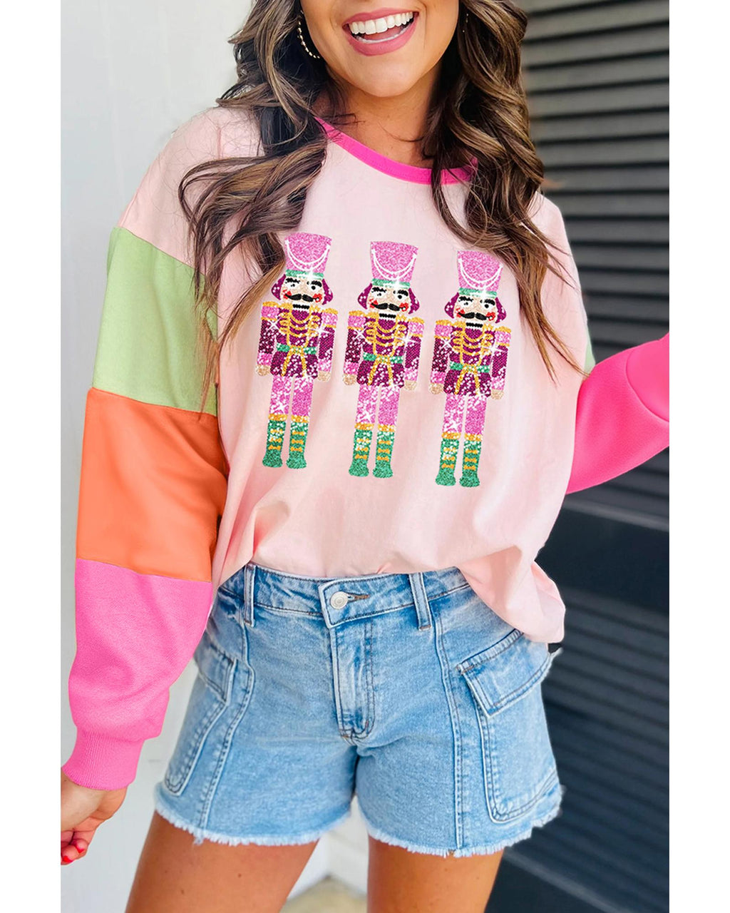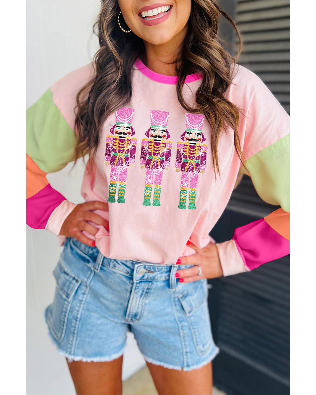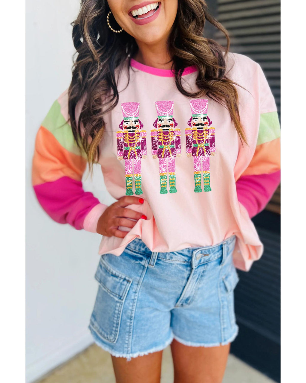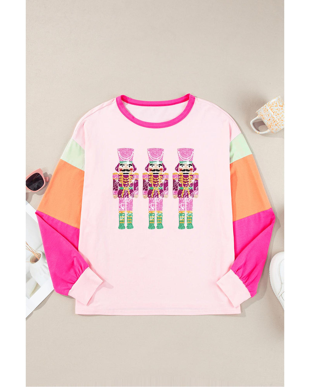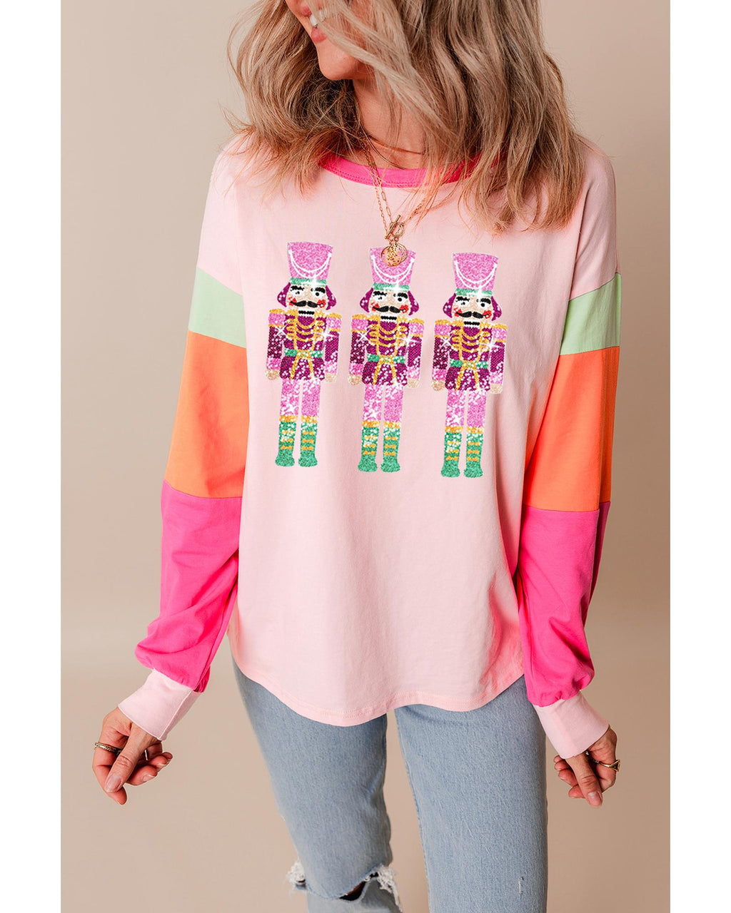 • Pink Christmas Sequin Nutcracker Graphic Colorblock Long Sleeve Top