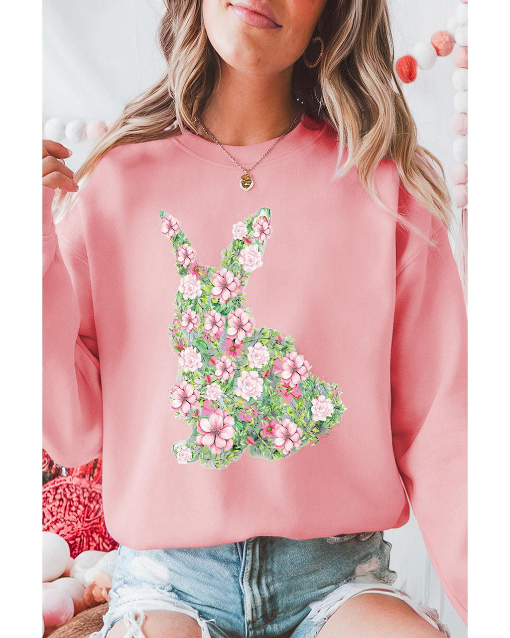 Pink Floral Bunny Printed Crewneck Easter Fashion Sweatshirt - M