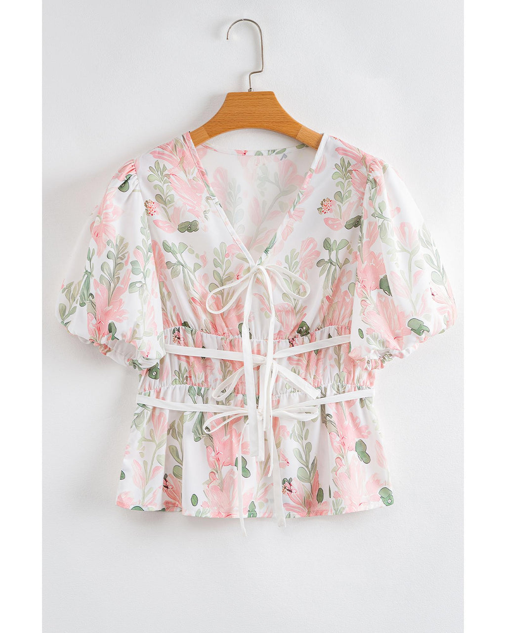 Pink Floral Puff Sleeve V Neck Tied Front Peplum Blouse - L