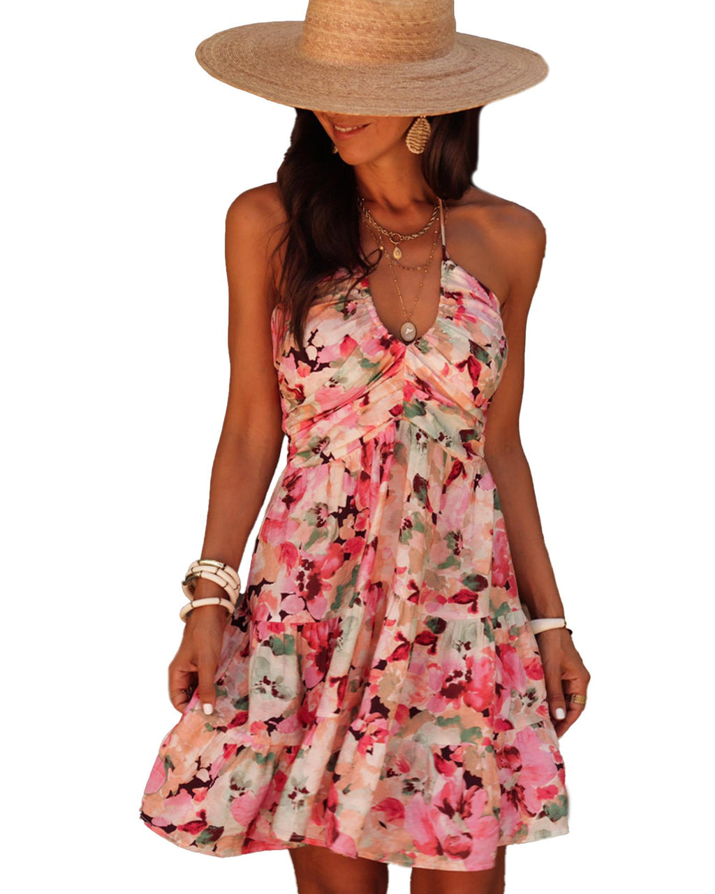 Pink Floral Sleeveless Halter Neck Shirred Back Ruffled Mini Dress - L