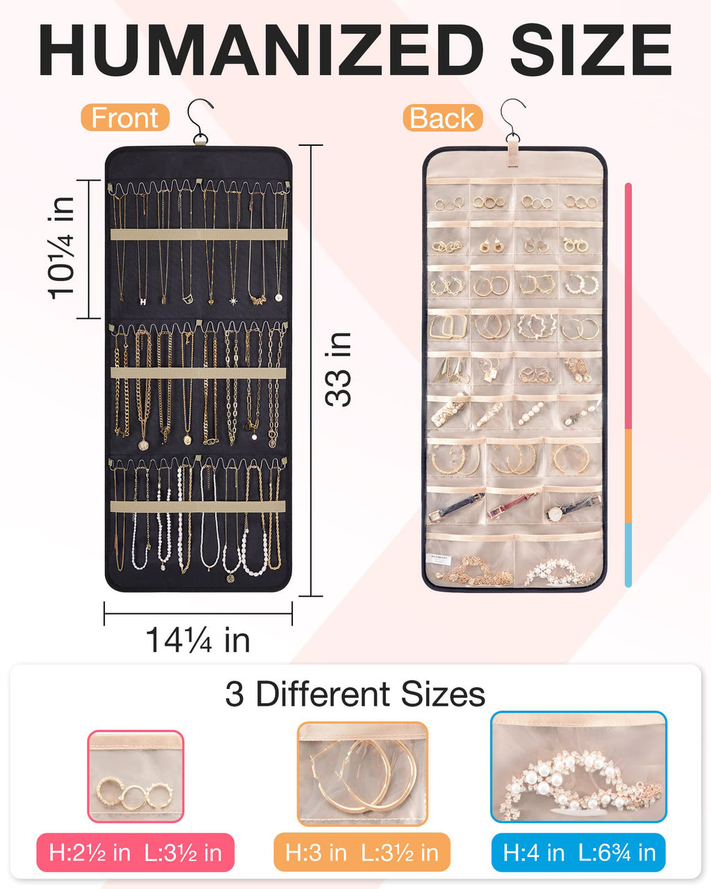 • Smart Double-Sided Storage: One side features 32 transparent PVC pockets in various sizes to hold earrings, rings, bracelets, and watches. The other side is equipped with strong hook-and-loop straps designed to hold necklaces securely, preventing them from tangling.