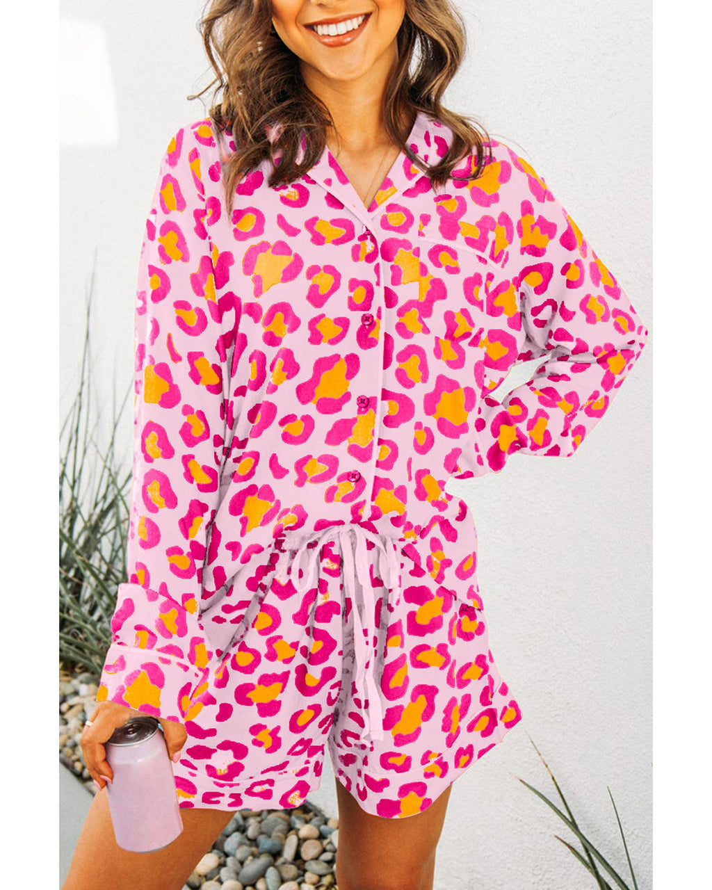 Pink Leopard Print Long Sleeve Shirt and Shorts Pajama Set - S