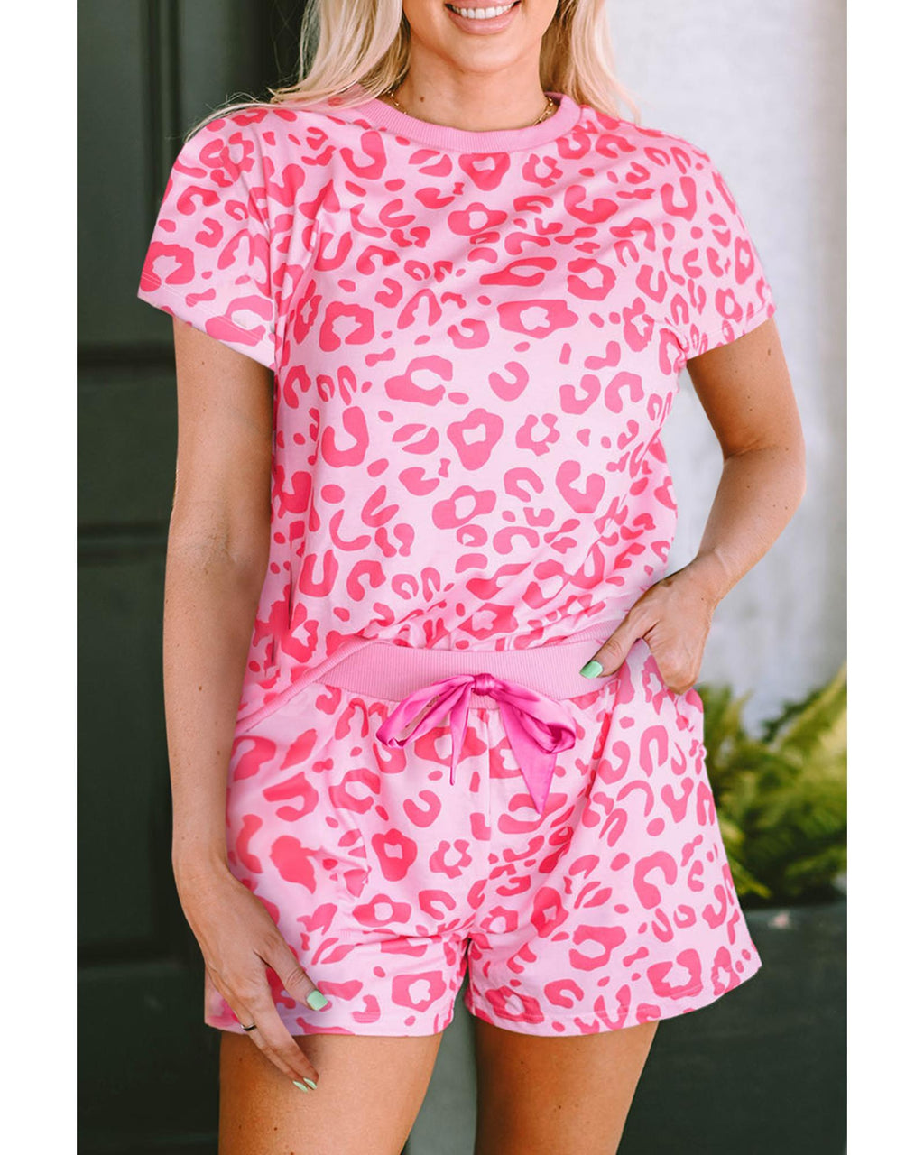 • Pink Leopard Print Tee and Satin Tie Shorts Lounge Set