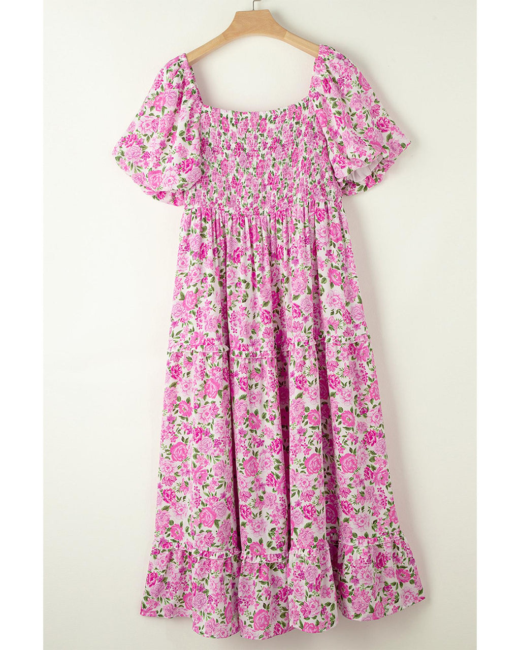 • Pink Plus Size Floral Print Smocked Puff Sleeve Dress