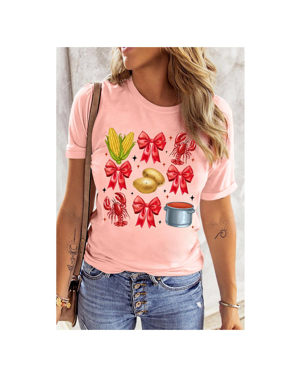 • Pink Summer Food Bow Crawfish Printed T Shirt
