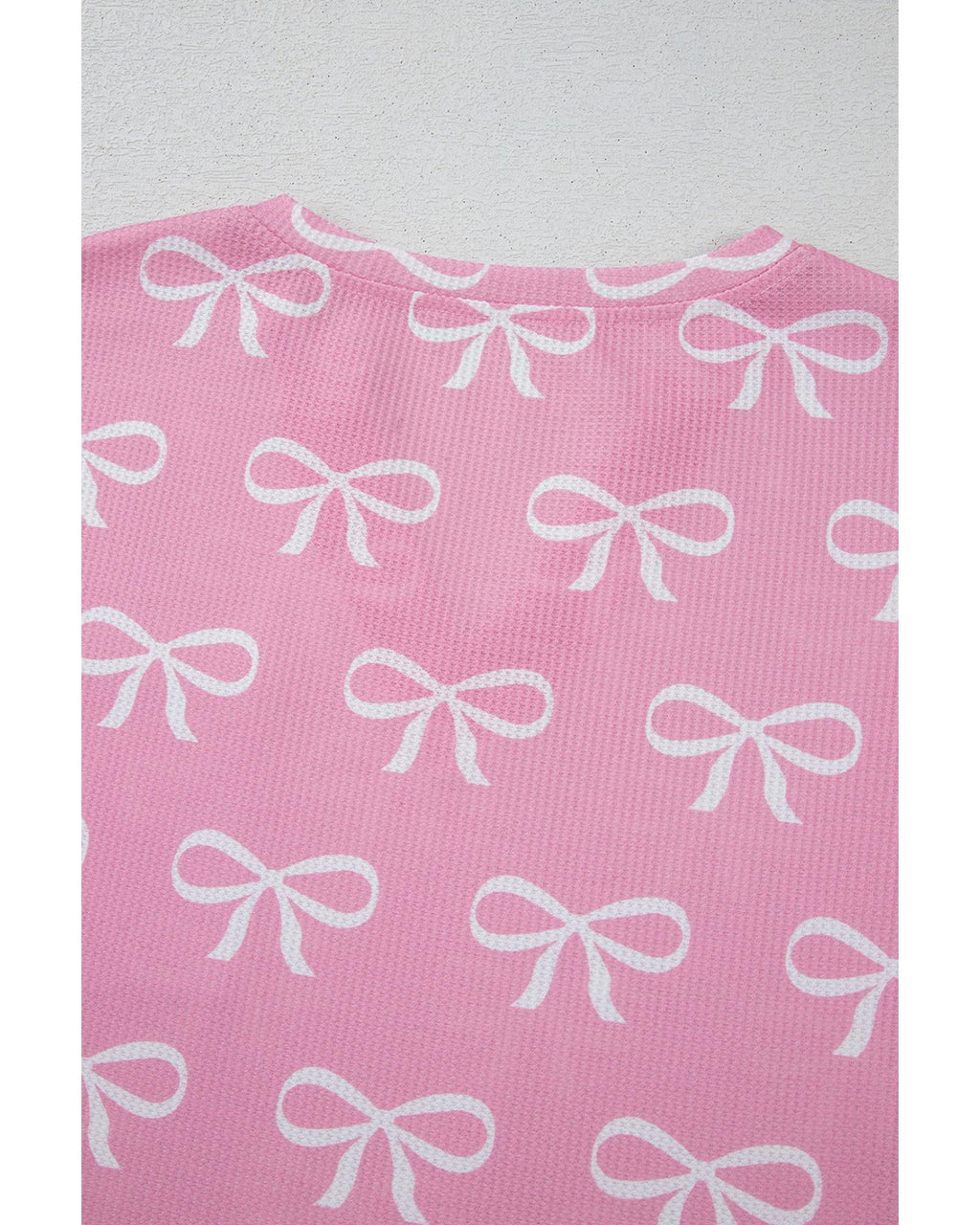 • Pink Waffle Knit Bowknot Printed V Neck T Shirt and Shorts Set