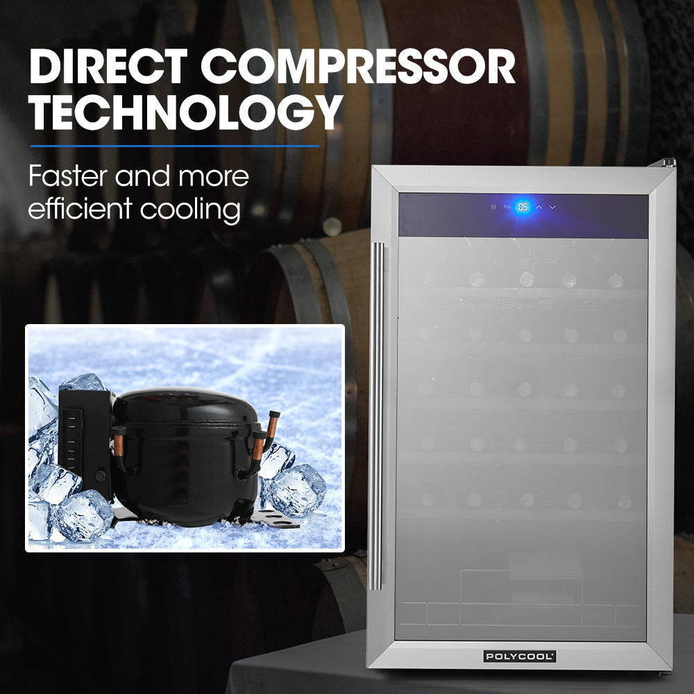 The PolyCool Acier Plus 95L/34 Bottle Wine Cooler Fridge has everything you need to enjoy refreshing and chilled wine anytime. This wine cooler has the latest direct compressor technology to keep the temperature perfect for your favourite vintage. The generous 95L capacity means you'll have more than enough room to store your best vintages. It has sliding shelves to make sure your favourite varietals are handy. The shelves are also removable so you can chill large format bottles. The PolyCool Acier Plus makes sure you are ready for any special occasion, big or small or your regular “Wine O’clock”.