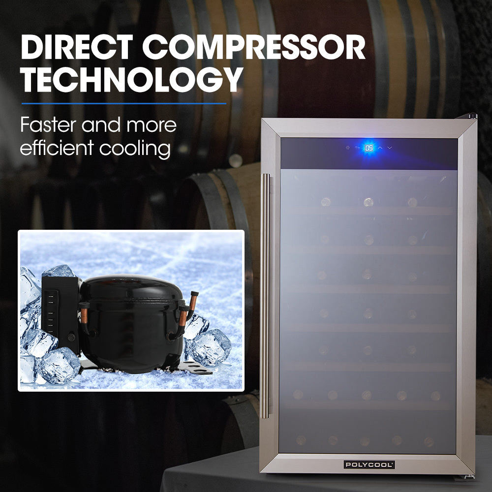 The PolyCool Acier Plus 128L/51 Bottle Wine Cooler Fridge has everything you need to enjoy refreshing and chilled wine anytime. This wine cooler has the latest direct compressor technology to keep the temperature perfect for your favourite vintage. The generous 128L capacity means you'll have more than enough room to store your best vintages. It has sliding shelves to make sure your favourite varietals are handy. The shelves are also removable so you can chill large format bottles. The PolyCool Acier Plus makes sure you are ready for any special occasion, big or small or your regular “Wine O’clock”.