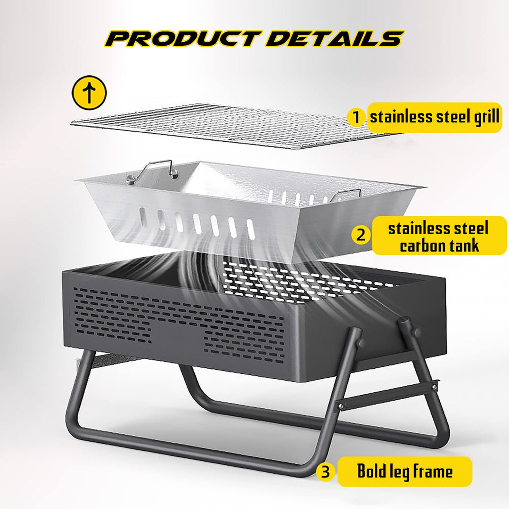 Take your outdoor cooking experience to the next level with the Portable Charcoal Grill. Designed for adventurers, families, and BBQ lovers alike, this compact yet powerful grill is perfect for camping trips, weekend picnics, backyard gatherings, or even a quiet evening by the firepit. Made from high-quality stainless steel, it offers excellent durability, rust resistance, and long-term performanceensuring you get years of use without compromise. The built-in ventilation system features 360 airflow holes on all sides, allowing for efficient oxygen intake and consistent charcoal combustion, so your food cooks evenly with rich, smoky flavor. Its sturdy foldable leg frame provides stable support when open and folds flat for easy transport and storage. Whether you're grilling steak, seafood, vegetables, or skewers, the wide stainless steel grate gives you ample space for feeding a small group. With its lightweight design and ergonomic handle, its simple to carry in your car trunk or backpack. Ideal for outdoor enthusiasts who value both function and style, this grill brings professional-level barbecue joy to any settingfrom bush campsites to suburban backyards.