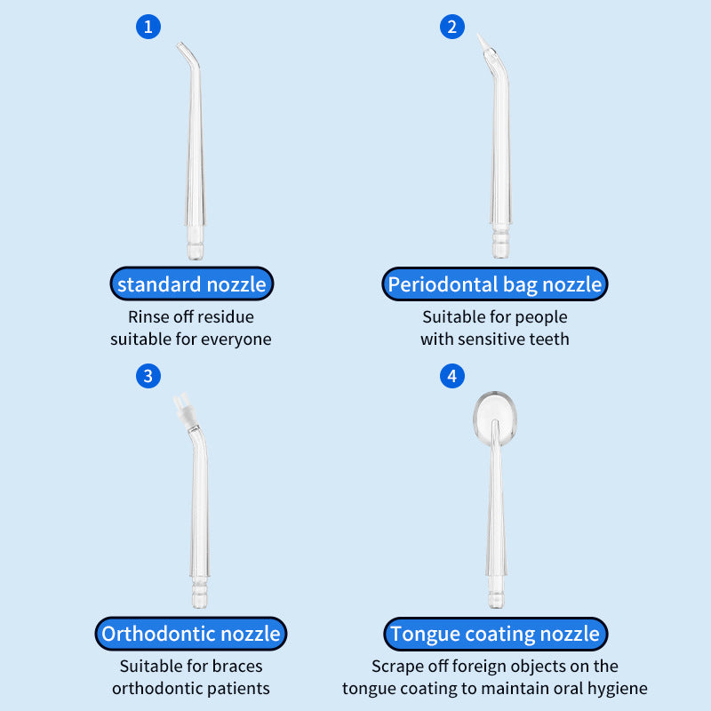 • 4 Nozzles Included: Standard, periodontal, orthodontic, and tongue cleaning options.