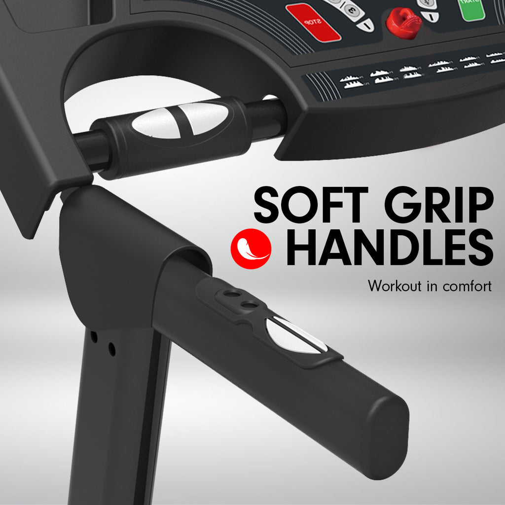 This compact treadmill has a 420mm x 1200mm running belt and is fitted with convenient features for distraction-free runs. It has four heart rate sensors on the side and front, so you can check your pulse no matter how you like to run. The side handles also have start/stop and speed control buttons for quick and easy access.