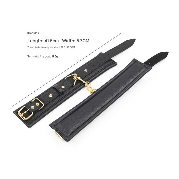 Indulge in playful exploration with this Premium PU Leather Adjustable Restraint Set. This versatile collection includes a generously padded collar, a pair of padded handcuffs, and a pair of padded ankle cuffs, all crafted from high-quality PU leather for a luxurious feel and durability. Each piece features soft inner padding for enhanced comfort and adjustable buckle closures to ensure a secure and customizable fit. The set is accented with stylish metal hardware, including D-rings for attachment points. The collar comes with a detachable chain leash featuring a PU leather handle. The cuffs may also include connecting chains or D-rings for varied play scenarios. This set is designed for consensual adult novelty use, offering a sophisticated way to explore restraint play.