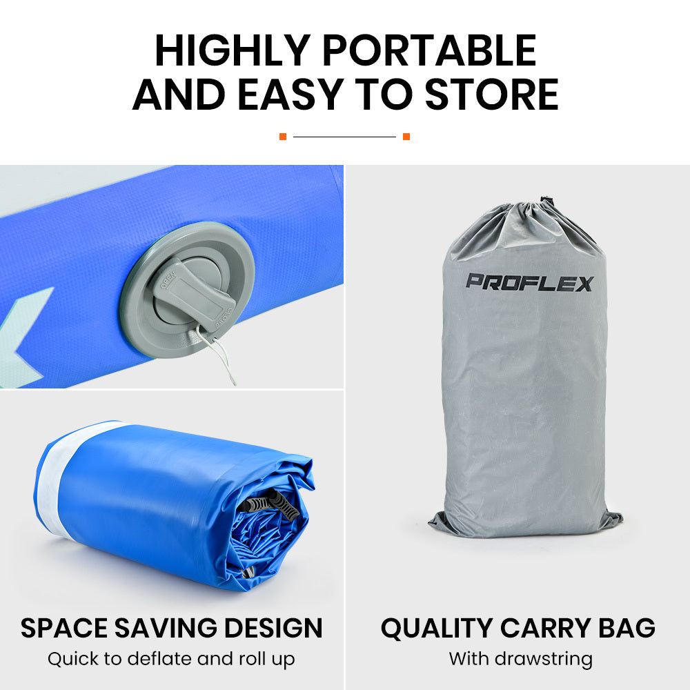 4 reinforced handles and the lightweight design allow you to easily transport your Air Track to wherever you need it. After deflation, the Air Track can be quickly rolled up and easily carried or stored in the included Proflex drawstring carry bag.