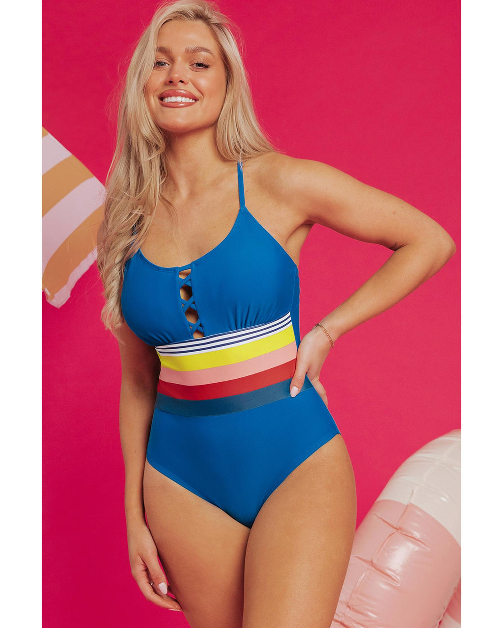 • Prussian Blue Contrast Stripe Accent Crisscross One Piece Swimwear