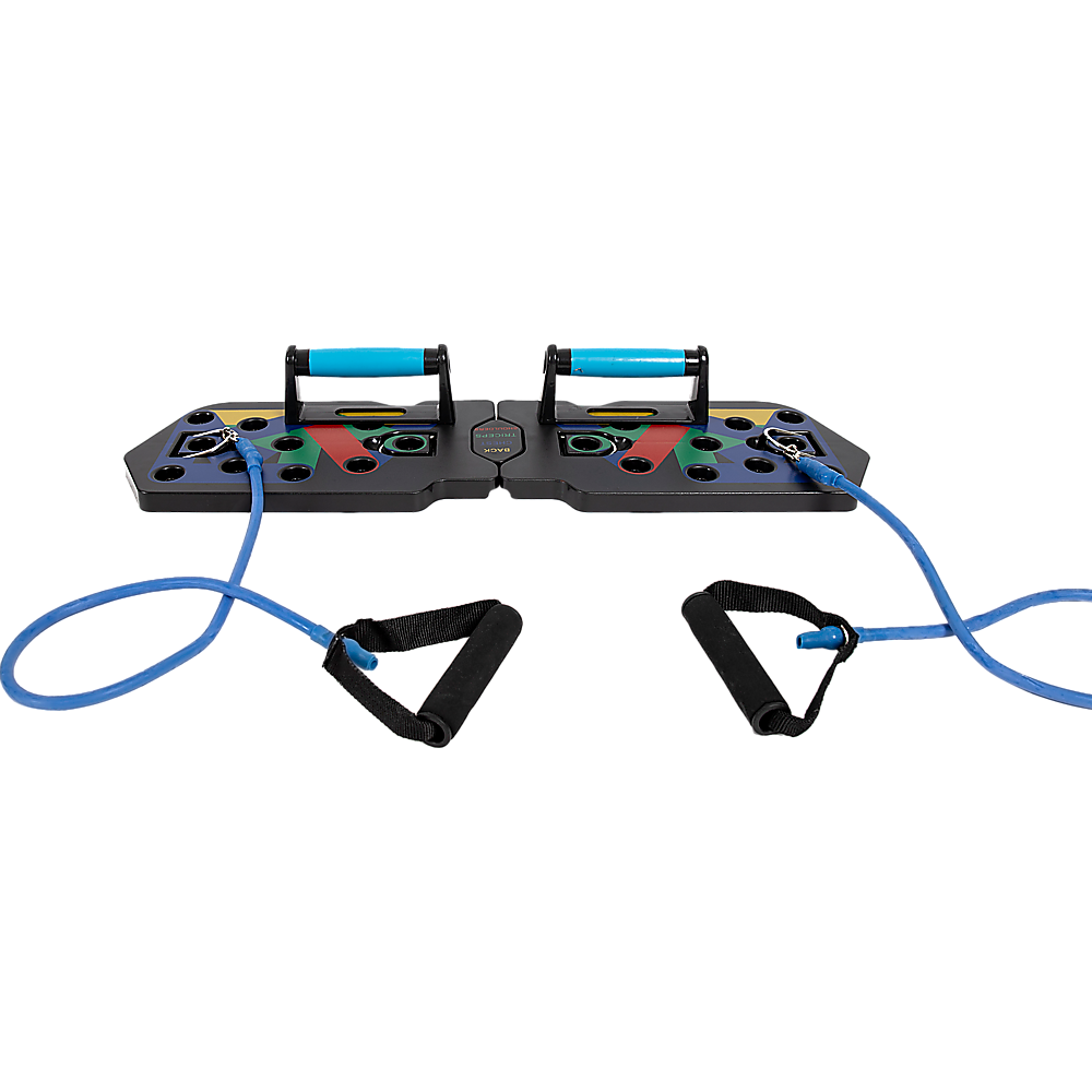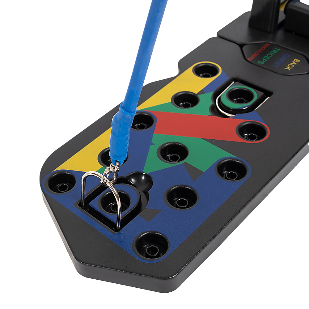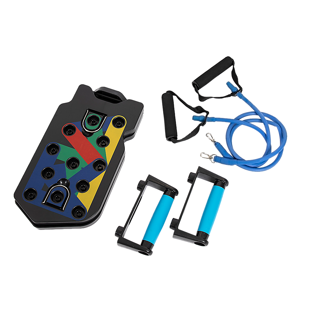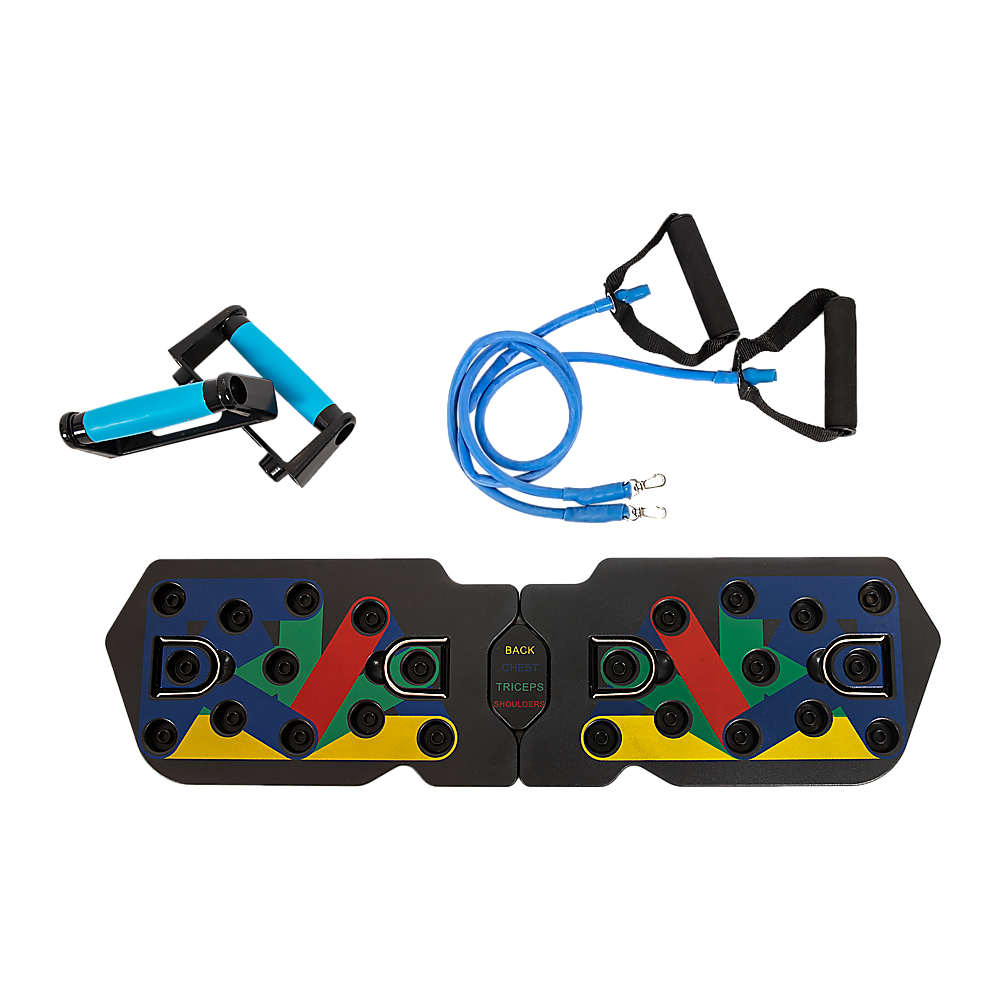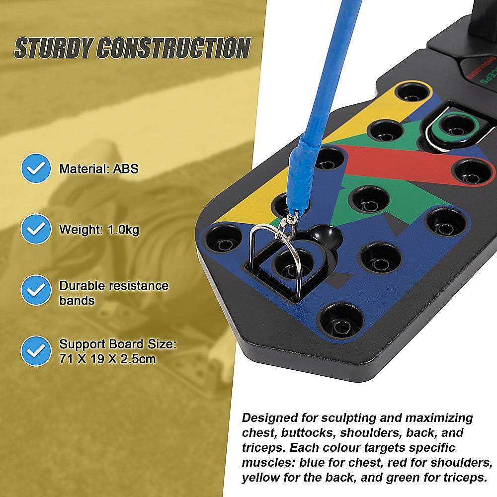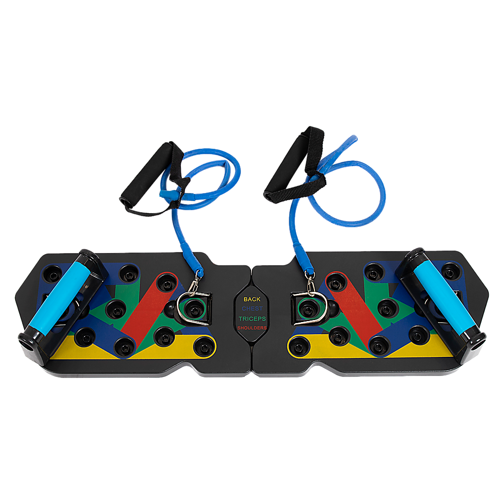 Experience the advance  and enhanced 13-in-1 push up bars with resistance bands. Designed for sculpting and maximizing chest, buttocks, shoulders, back, and triceps. Each colour targets specific muscles: blue for chest, red for shoulders, yellow for the back, and green for triceps.